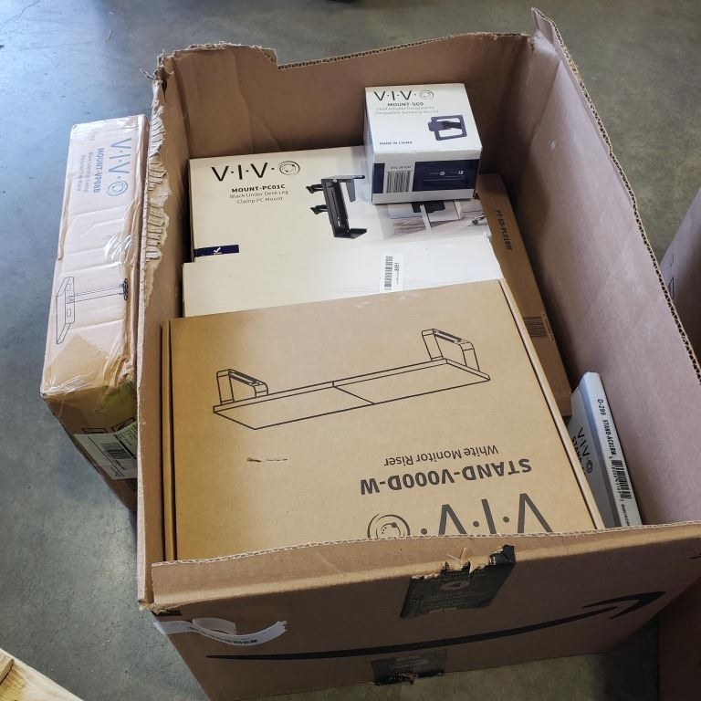 LOT OF AS NEW VIVO MOUNTS AND ACCESSORIES, DESK ACCESSORIES ETC