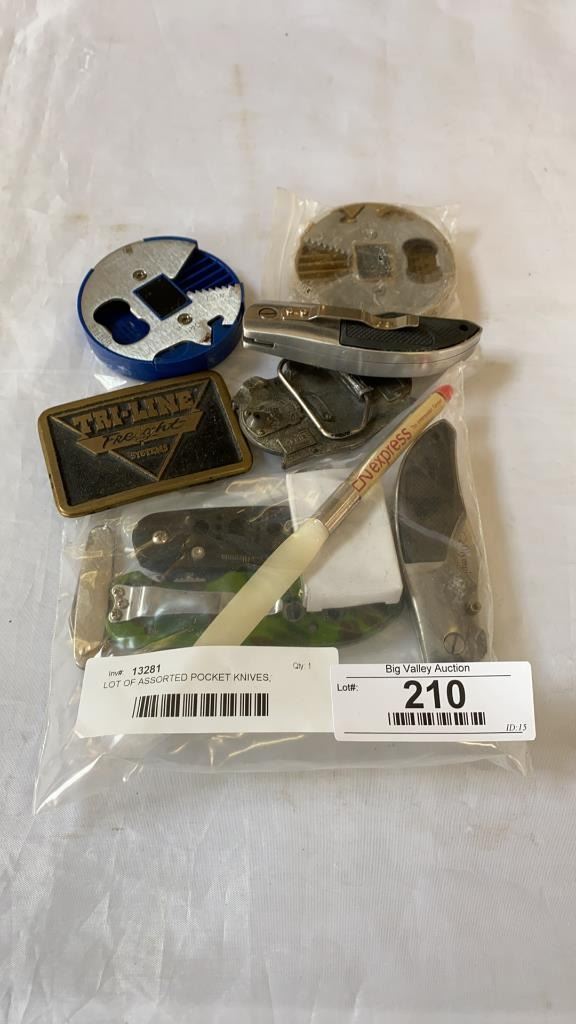 LOT OF ASSORTED POCKET KNIVES, BOTTLE OPENERS, AND BELT BUCKLES