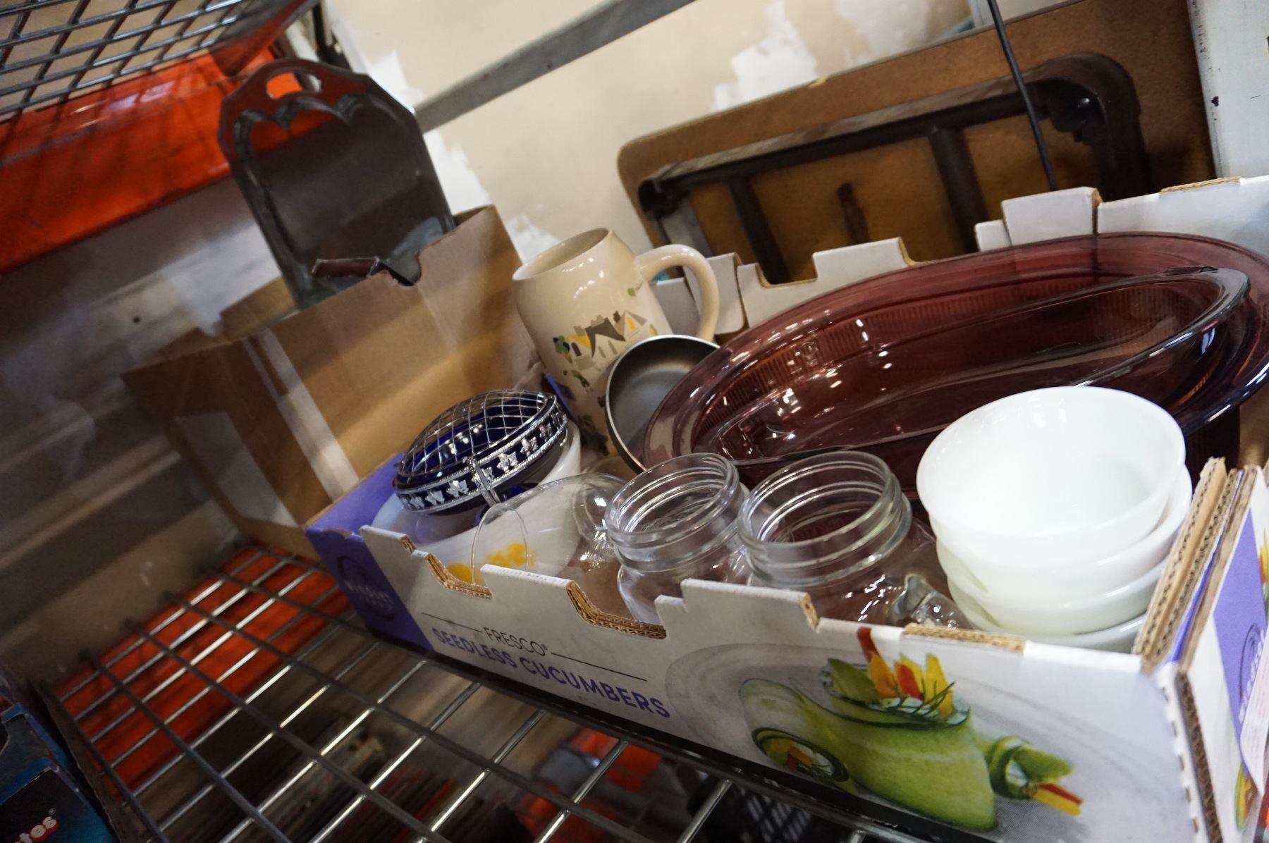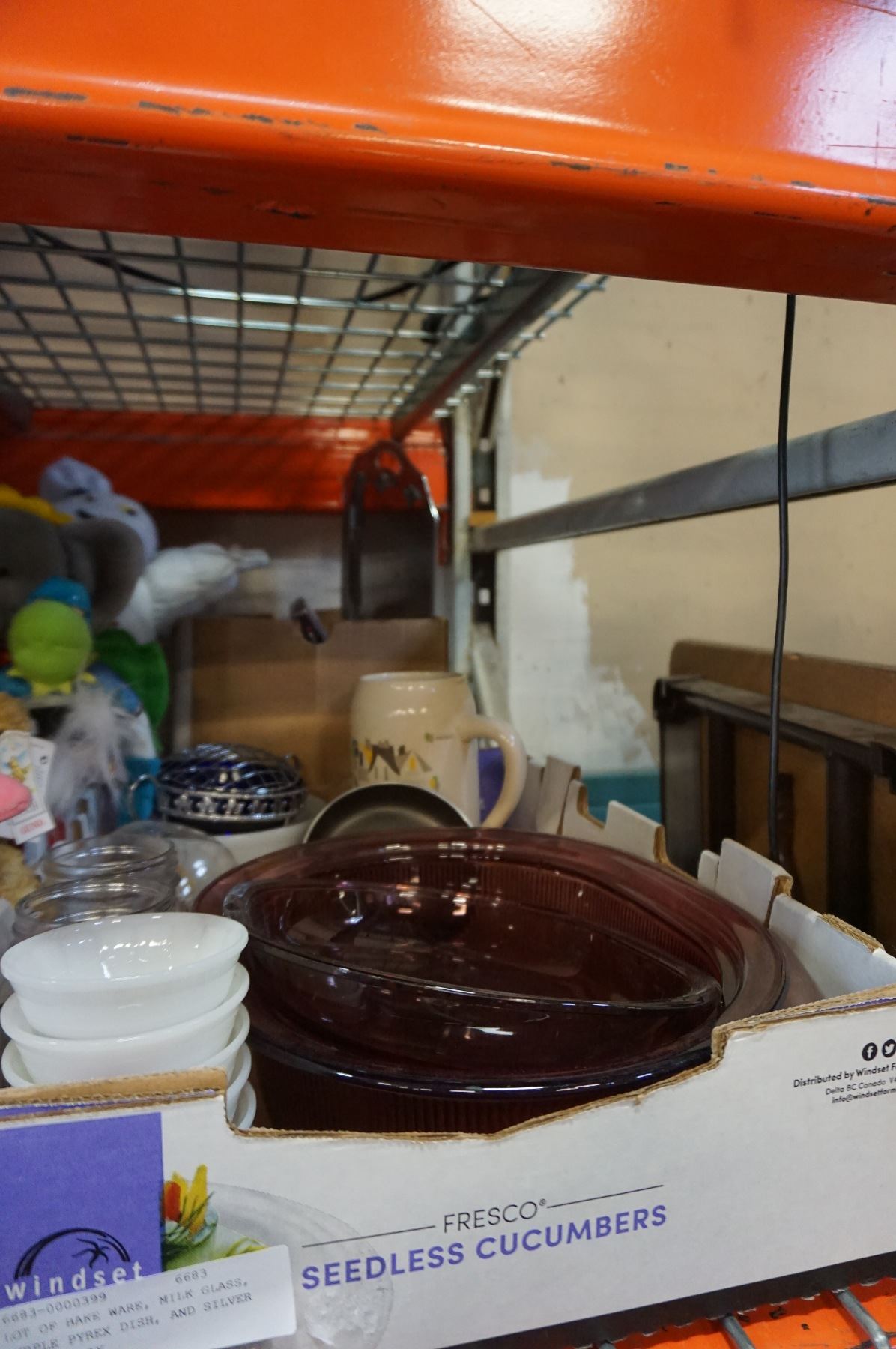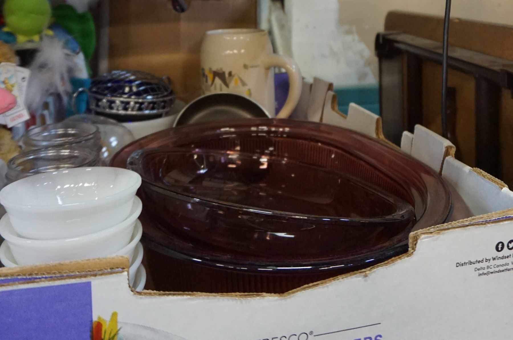 LOT OF BAKE WARE, MILK GLASS, PURPLE PYREX DISH, AND SILVER PLATED TRAY