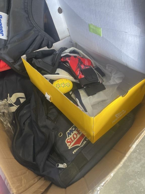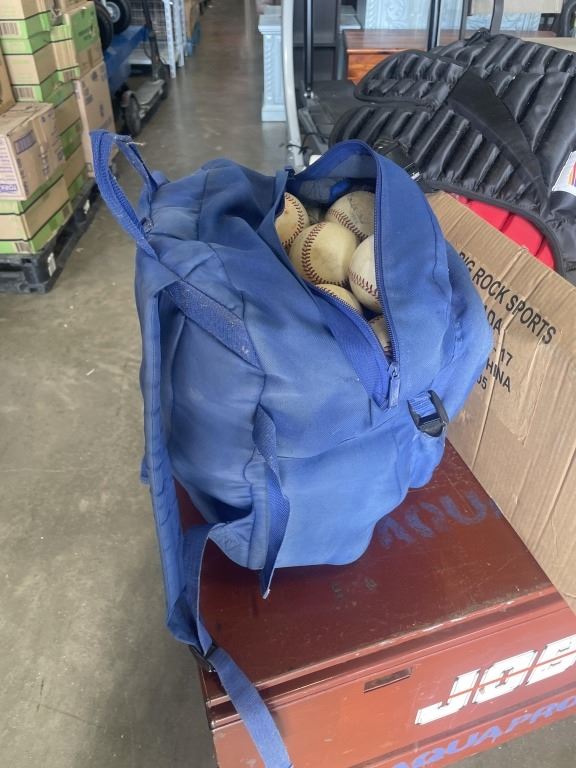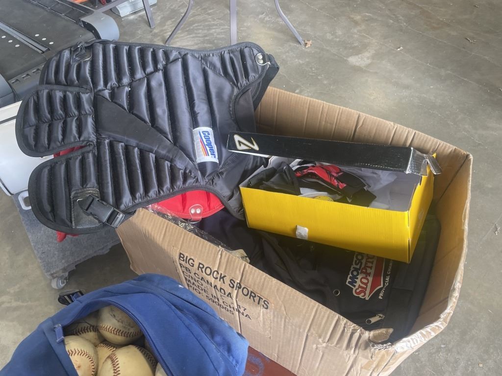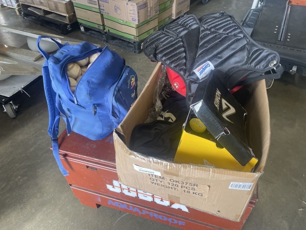 LOT OF BASEBALL EQUIMENT CATCHER'S CHEST PADS, APPROX 40 REGULATION BASEBALLS AND BATTING GLOVES