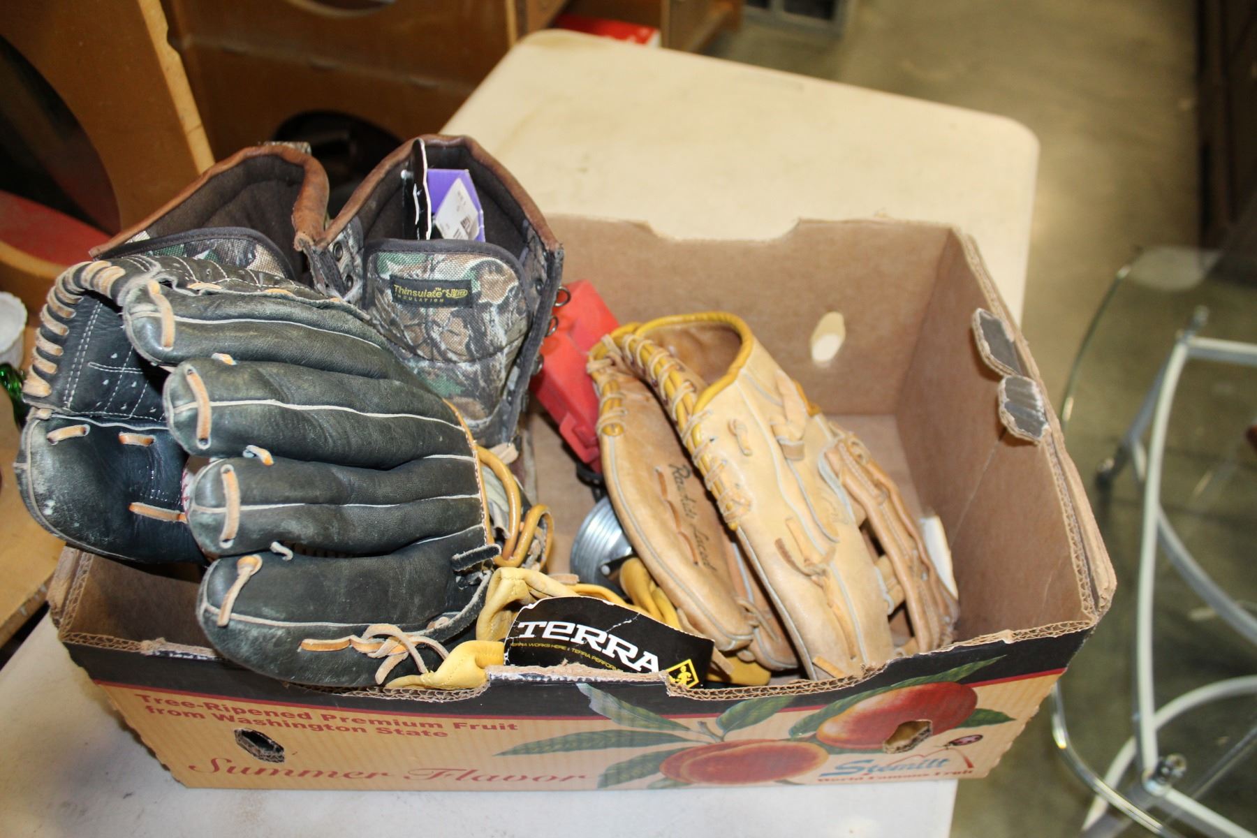 LOT OF BASEBALL GLOVES AND HIKING BOOTS