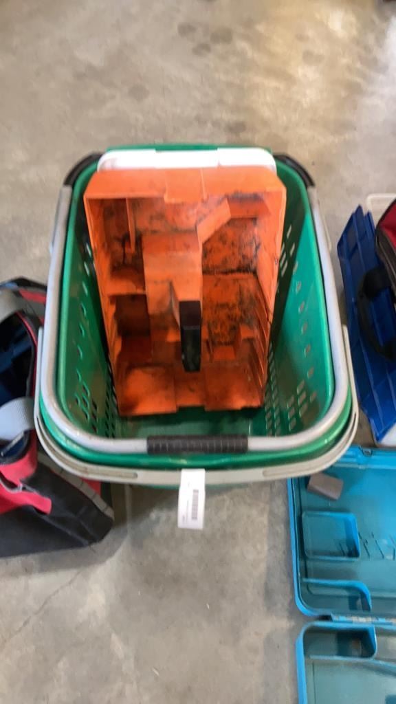 LOT OF BASKETS, TOOLBAG, TOTE, EMPTY TOOL BOXES, SAWHORSE BRACKETS