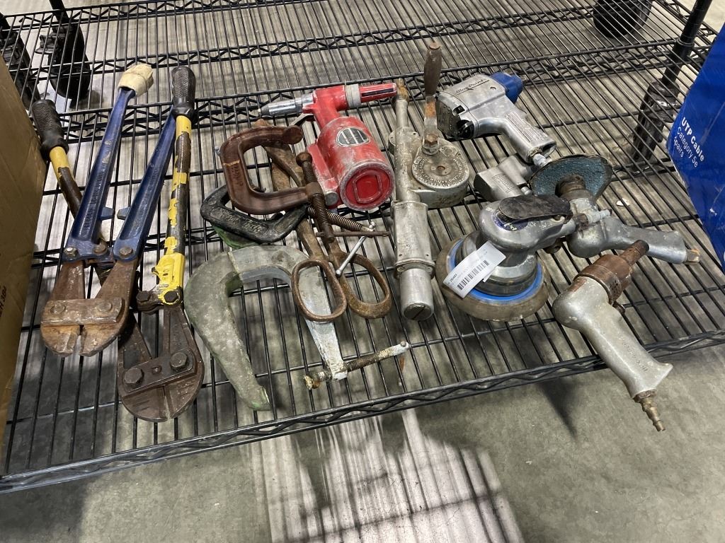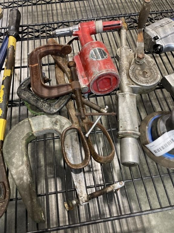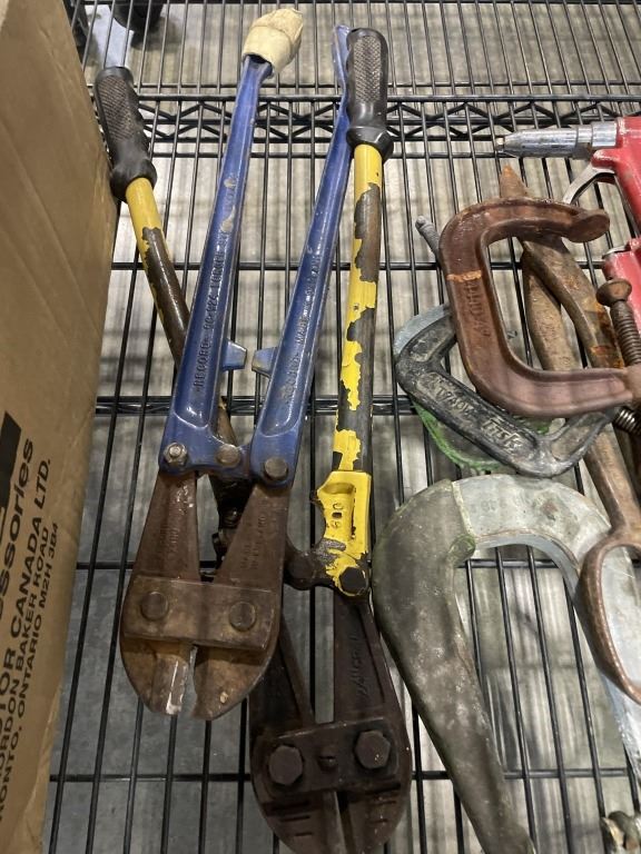 LOT OF C CLAMPS BOLT CUTTERS AND AIR TOOLS