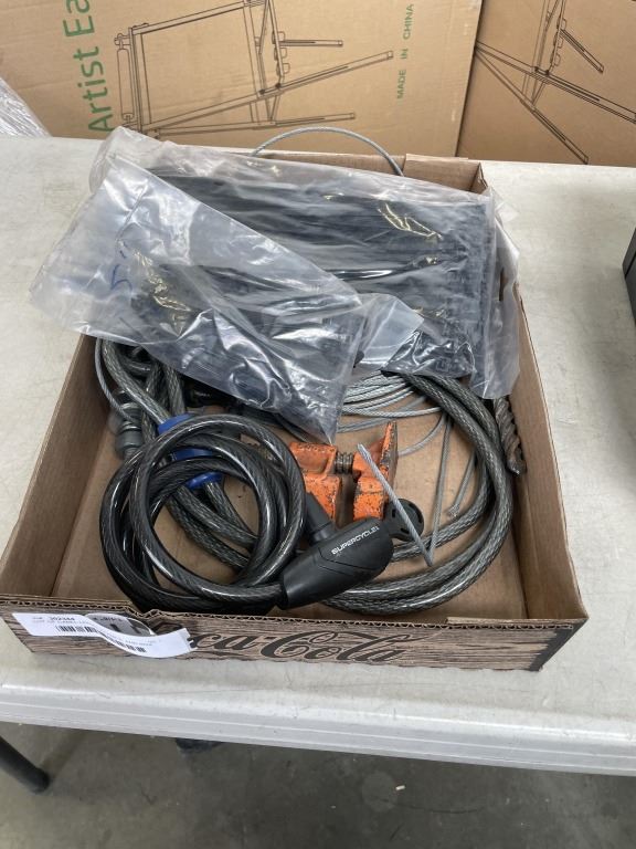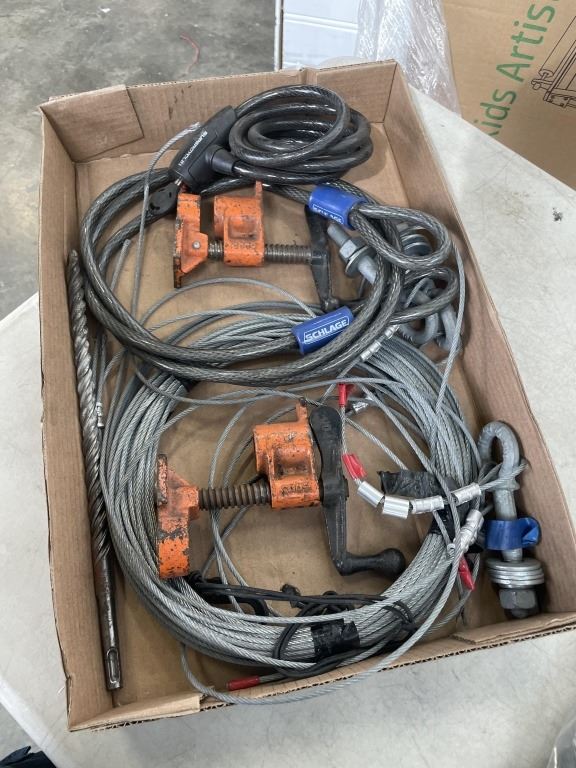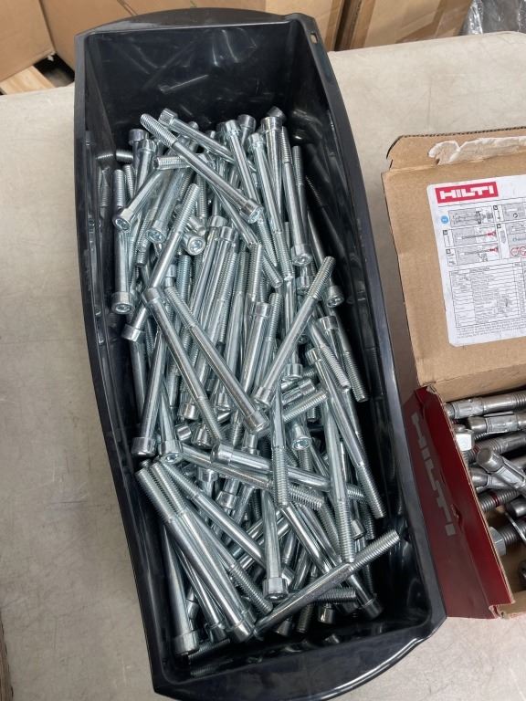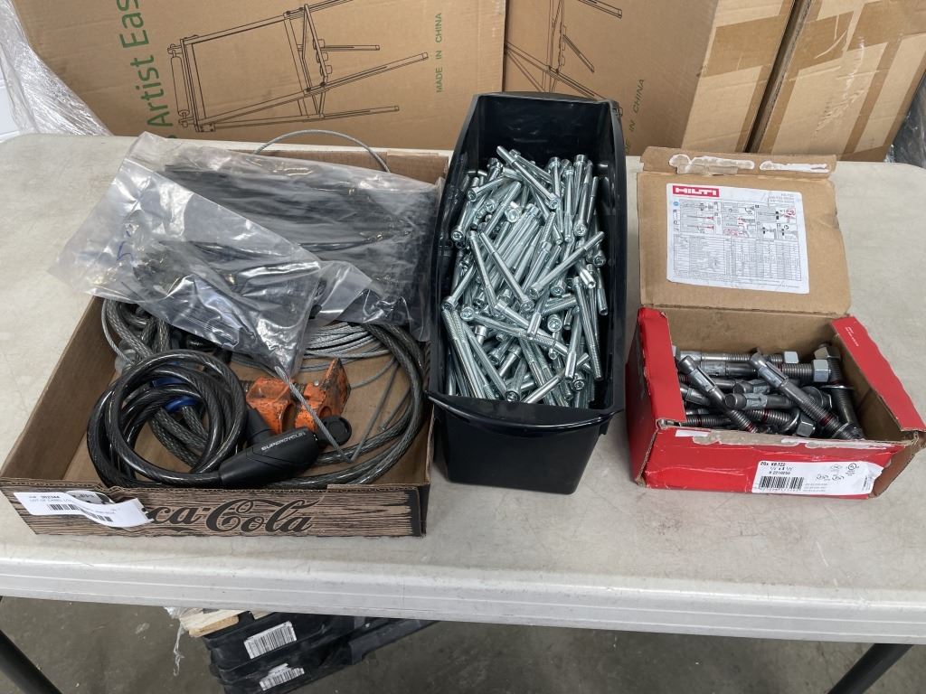 LOT OF CABEL LOCKS, CLAMPS, ZIPTIES, ETC, AND BIN OF BOLTS