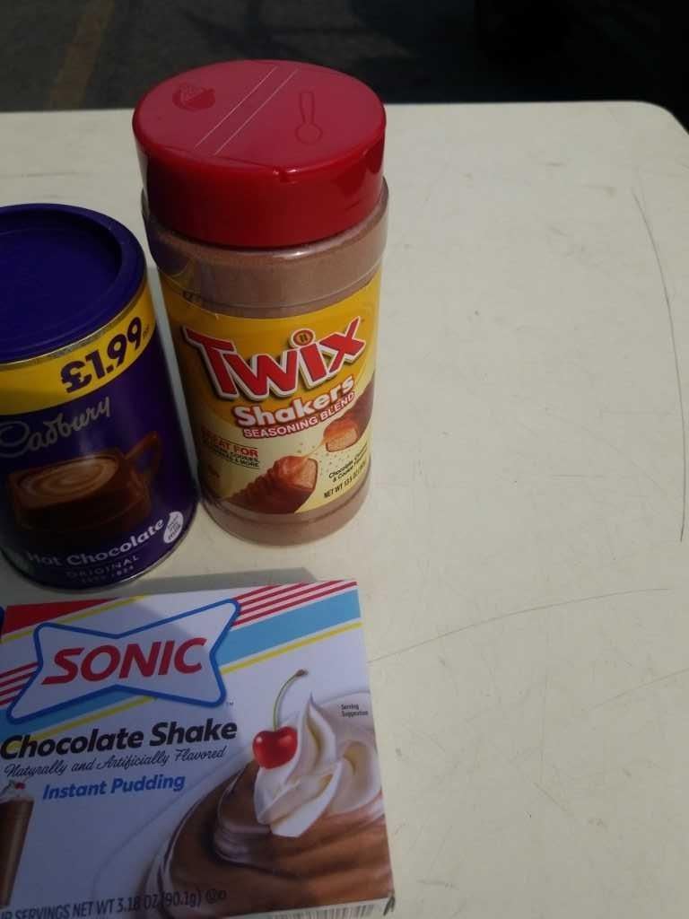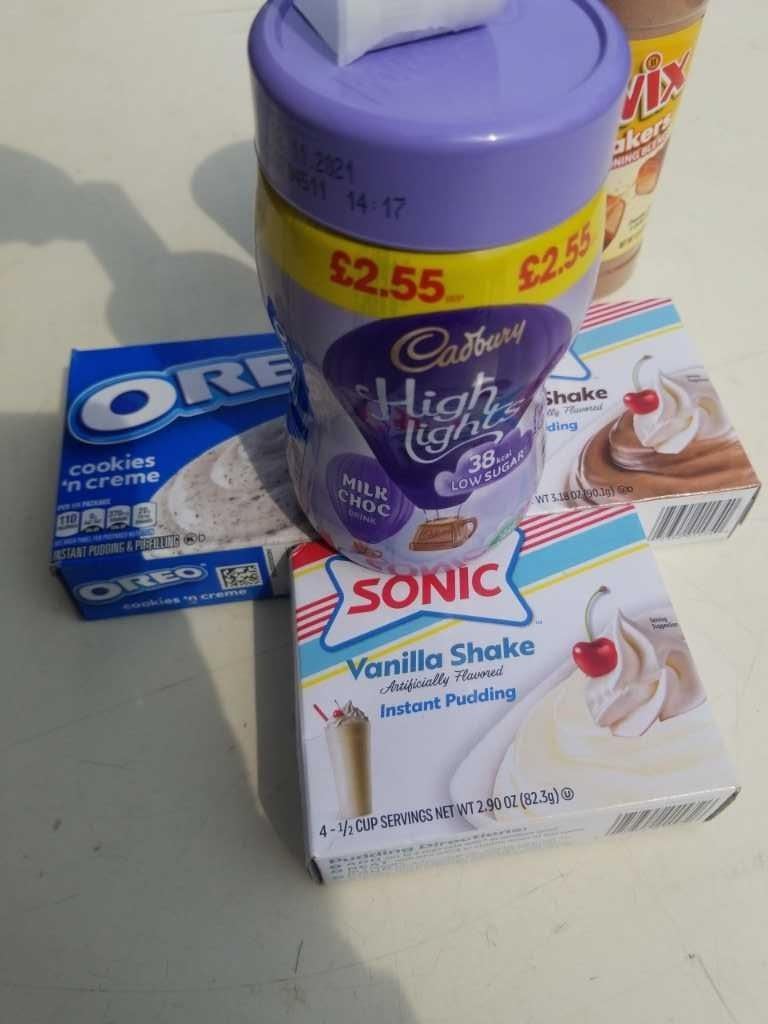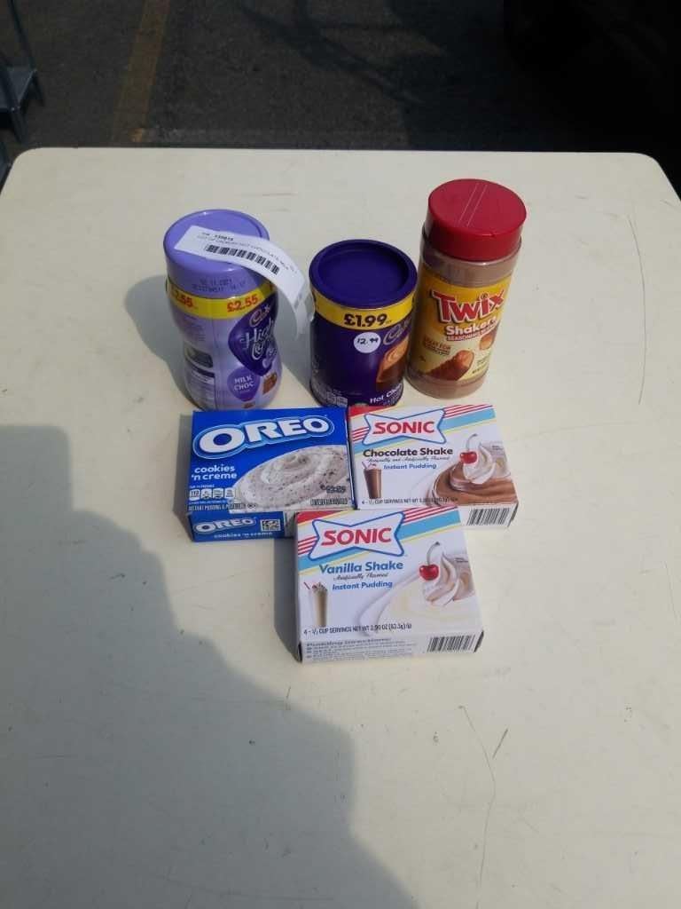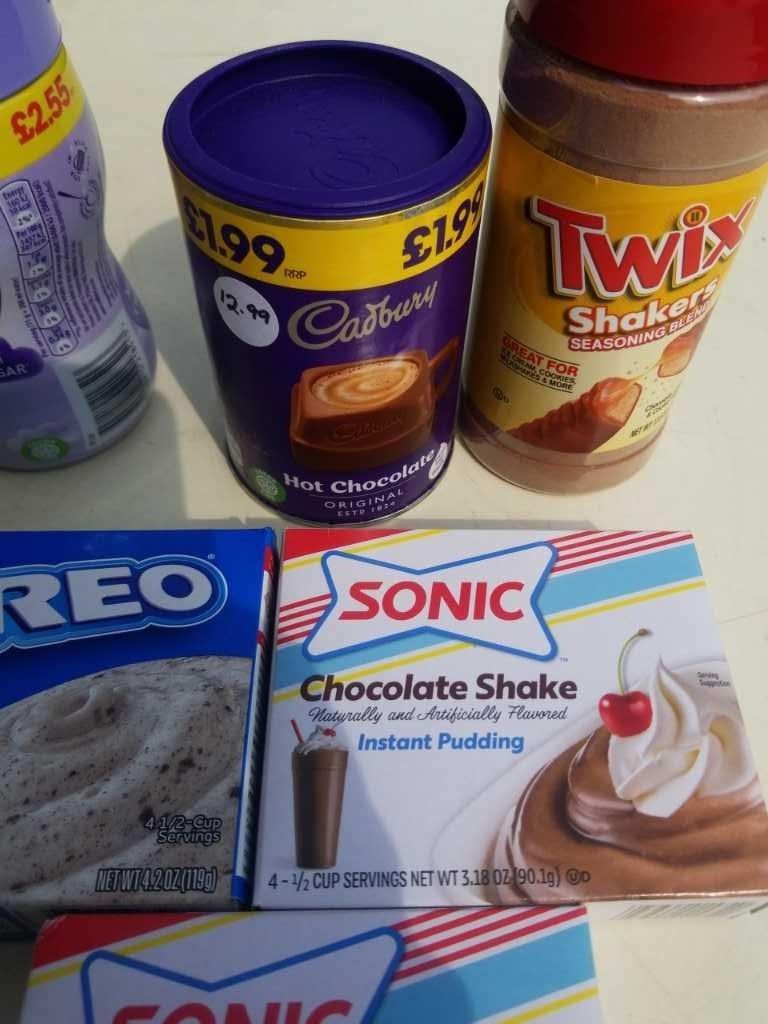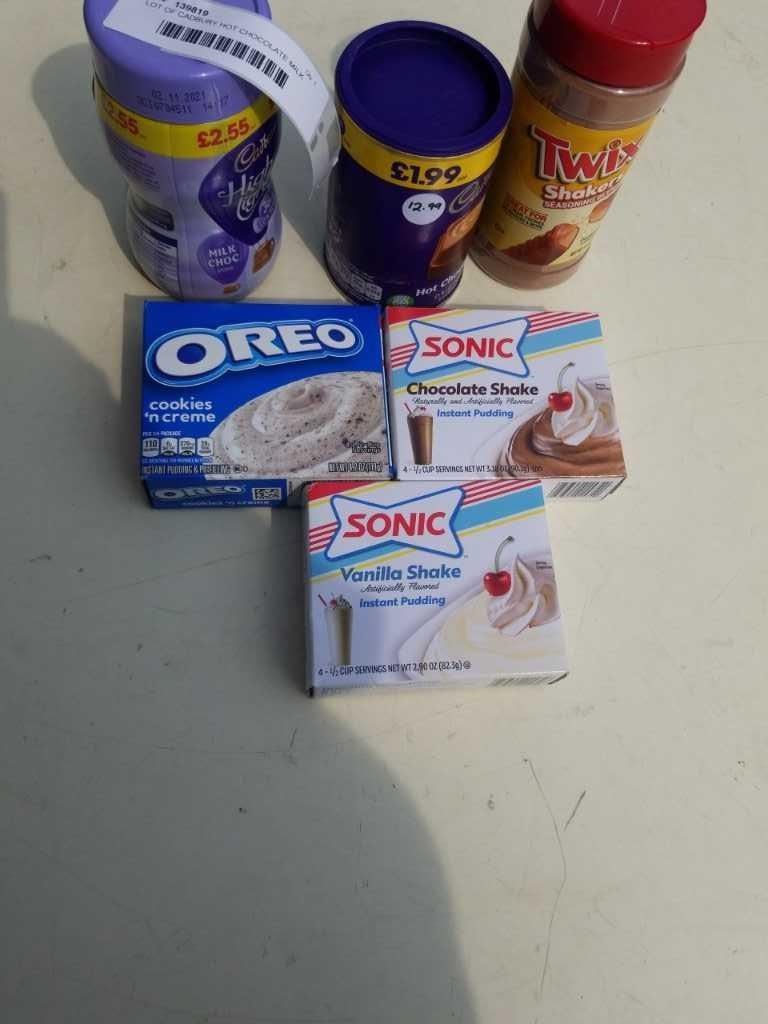 LOT OF CADBURY HOT CHOCOLATE FROTHY CHOCOLATE AND TWIX DRINK MIXES WITH PUDDING/ PIE FILLING POWDER- BB 2021/2023