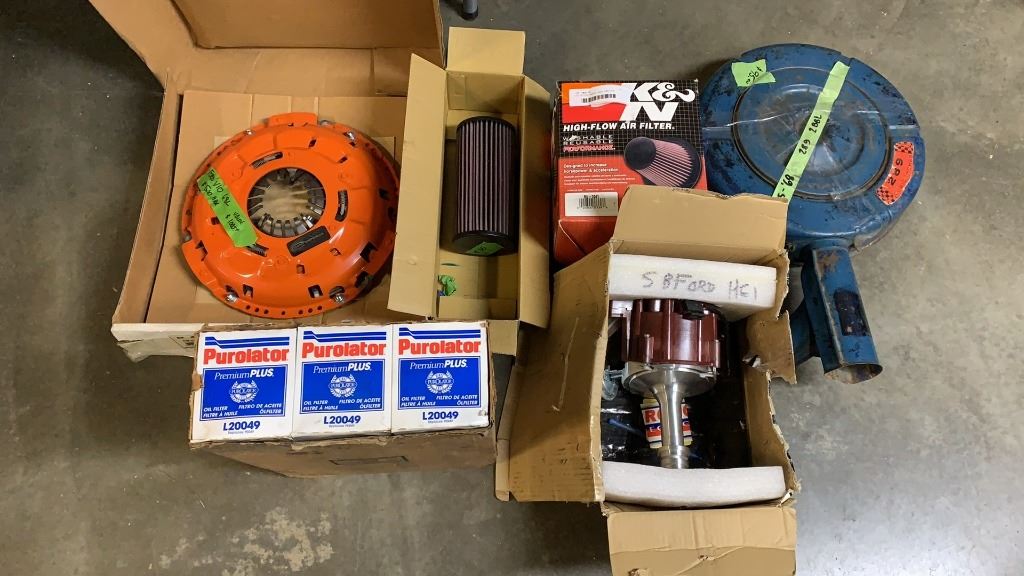 LOT OF CAR PARTS - DUAL FRICTION CENTERFORCE CLUTCH, OIL FILTERS, AIR FILTERS, ETC