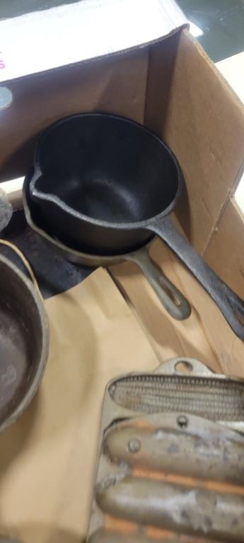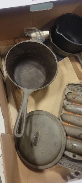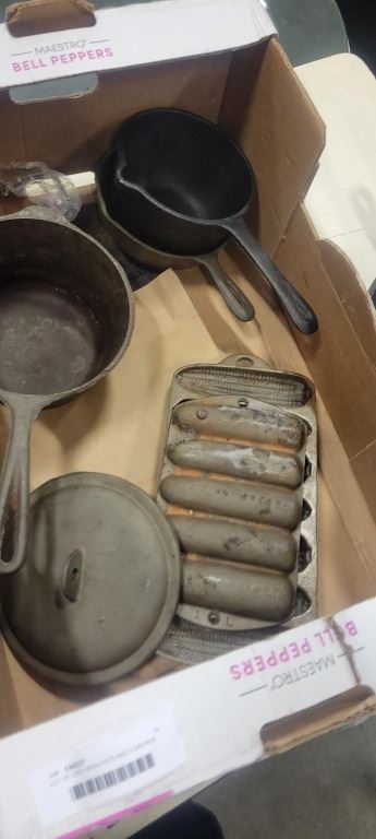 LOT OF CAST IRON POTS AND 2 VINTAGE CORN MUFFIN MOLDS