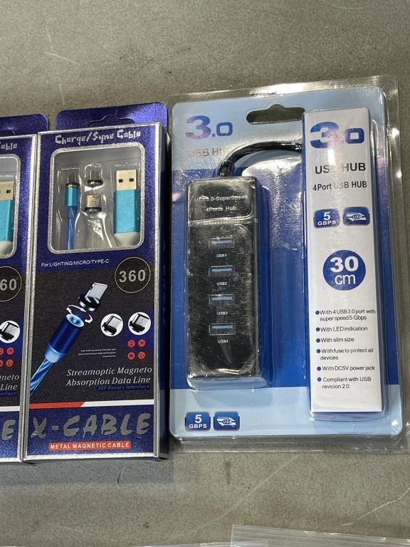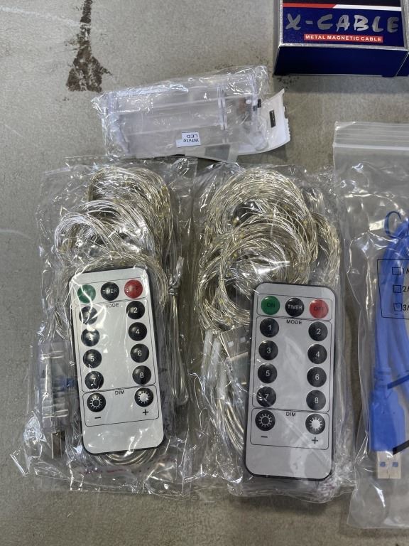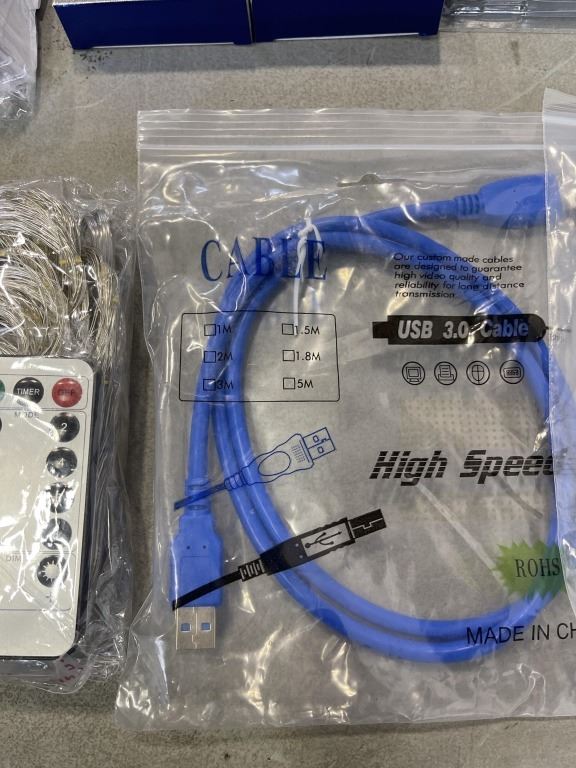LOT OF CHARGING CABLES, CAT CABLE, USB LED LIGHTS, ETC