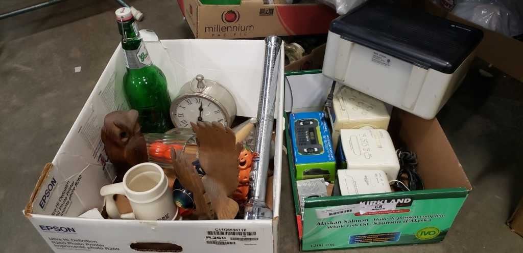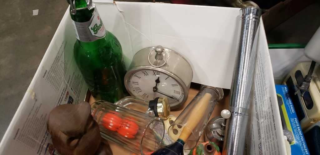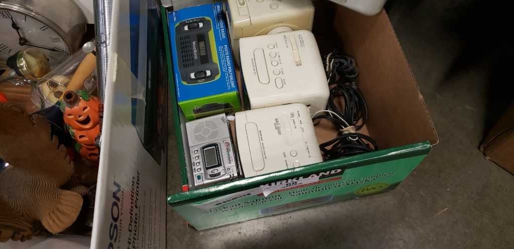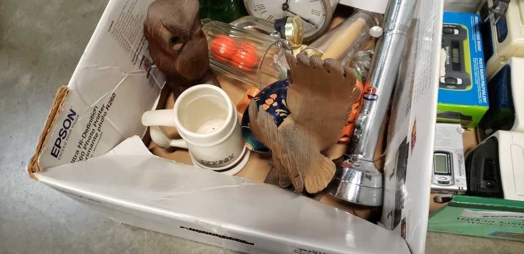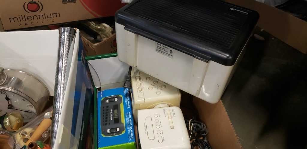 LOT OF CLOCKS, WOOD EAGLE FIGURE, VINTAGE FLASHLIGHT, ALARM CLOCKS AND HEATER