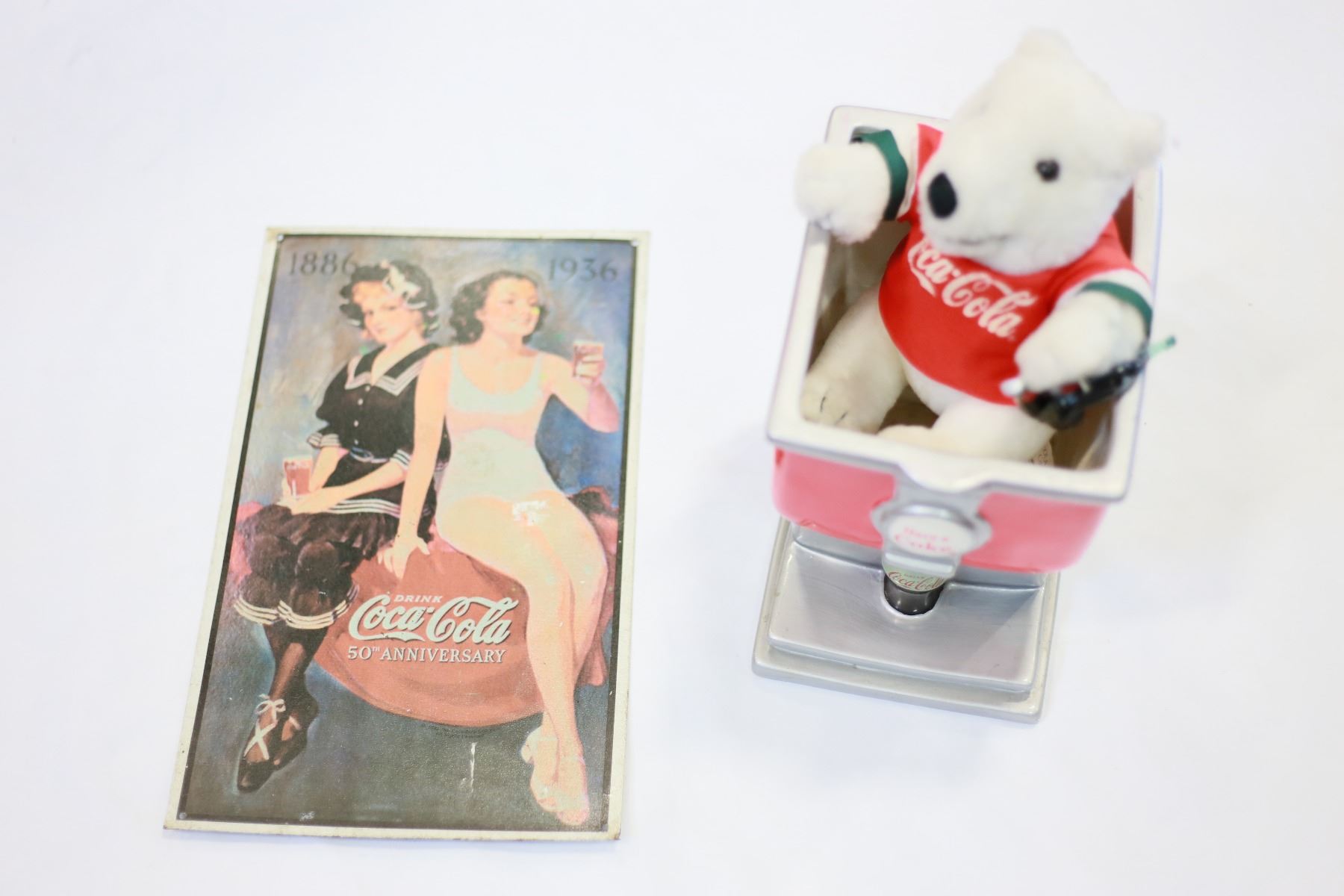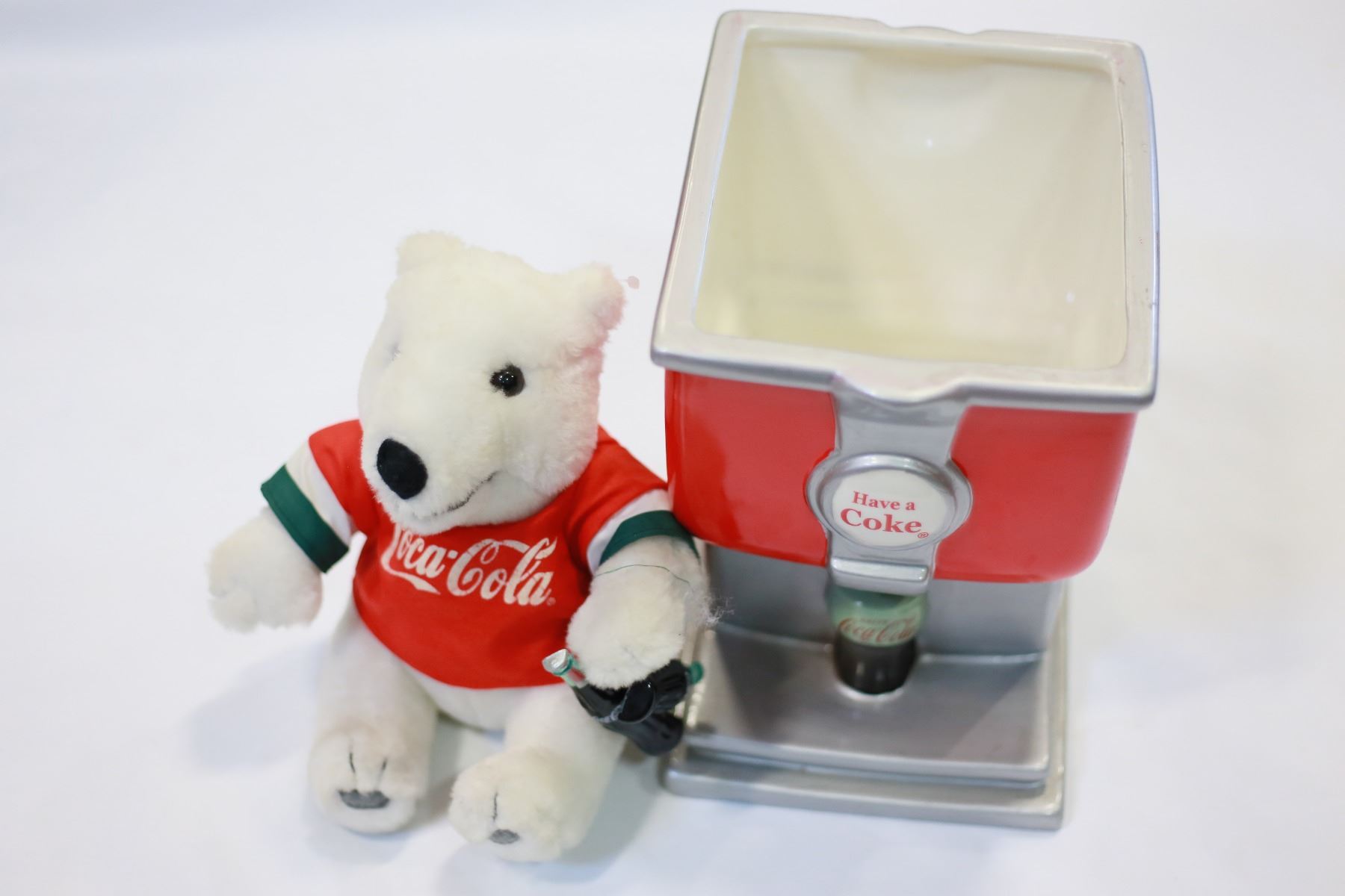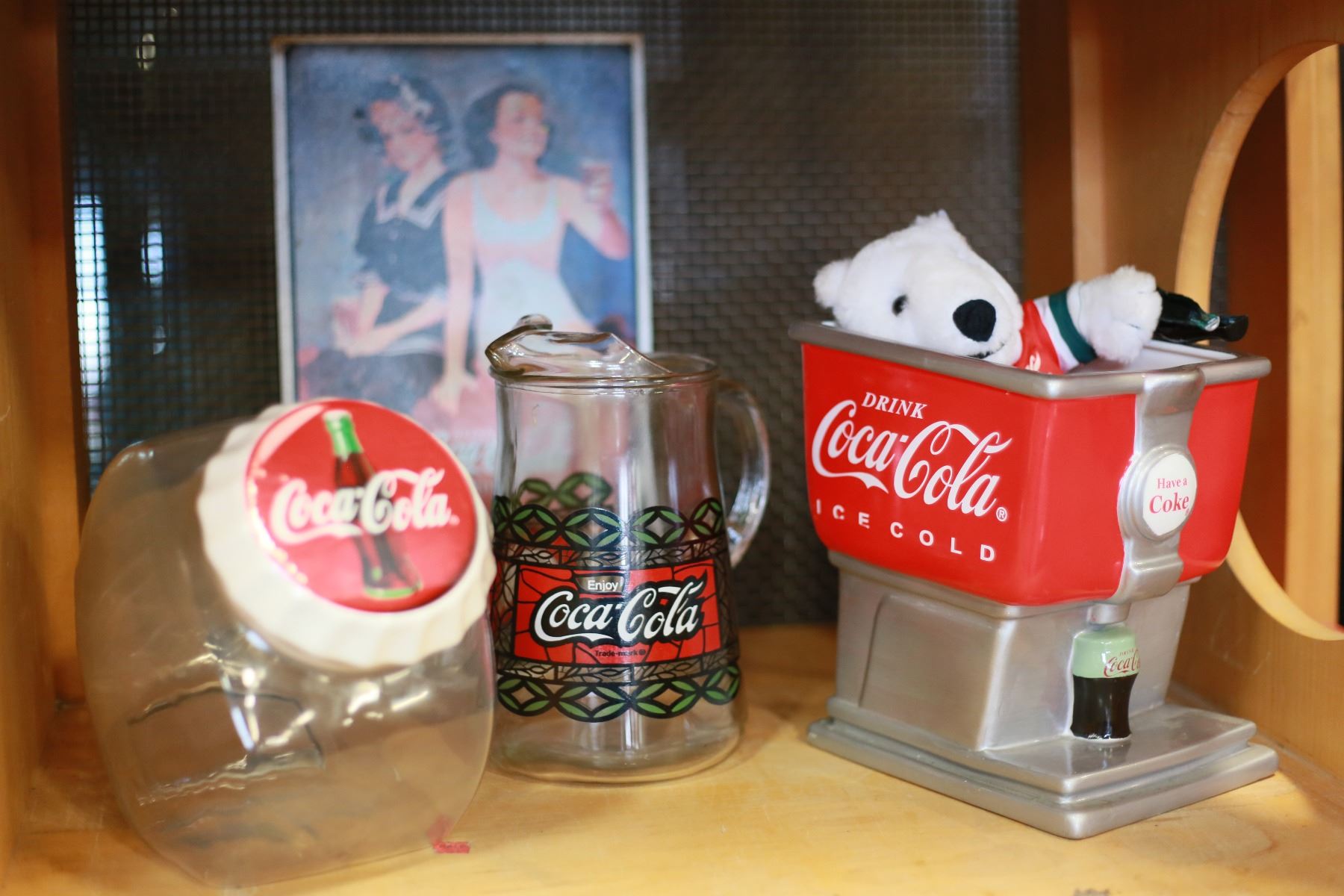 LOT OF COCA COLA COOKIE JARS JUICE JUG AND POLAR BEAR STUFFY AND 50TH ANNIVERSARY PRINT