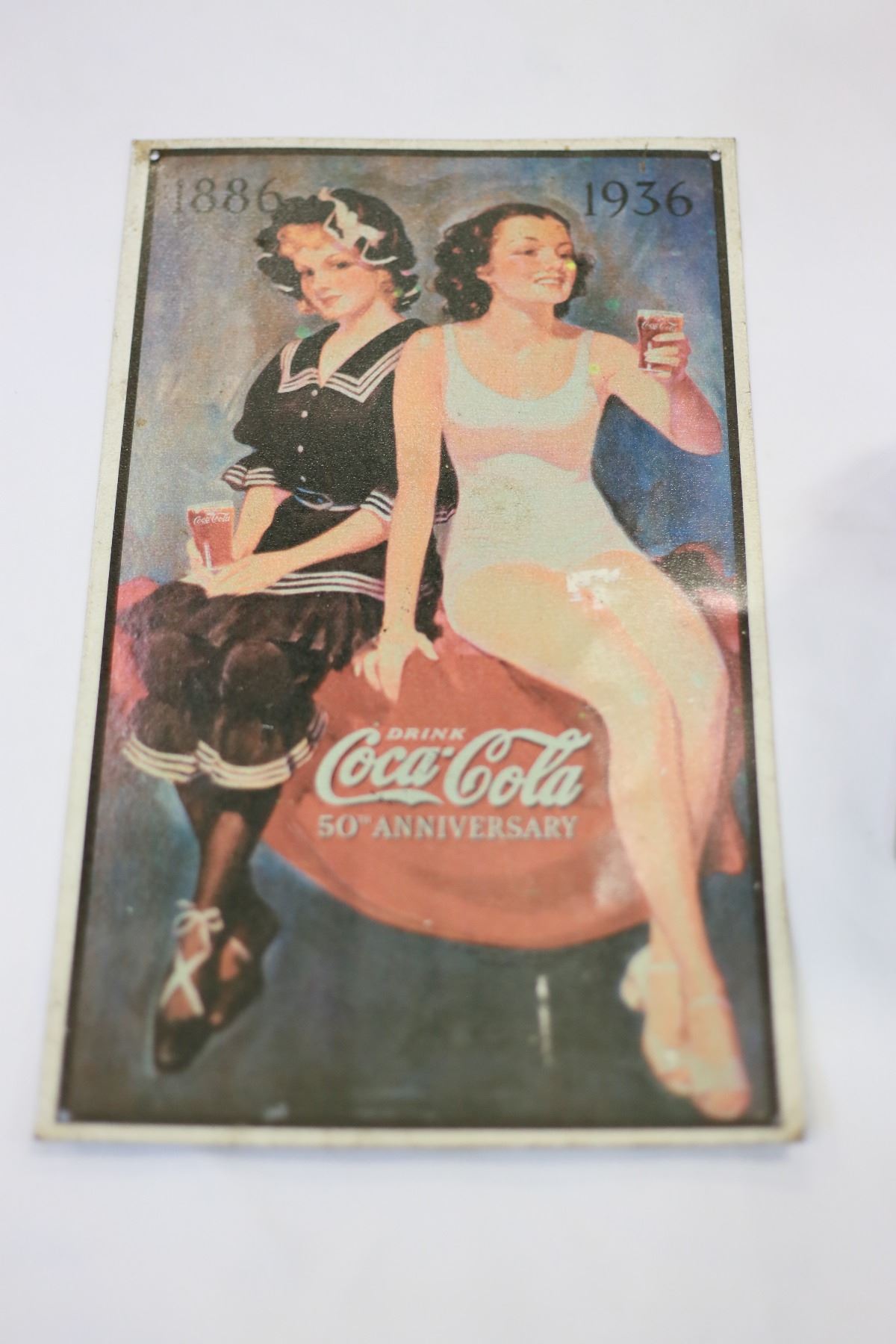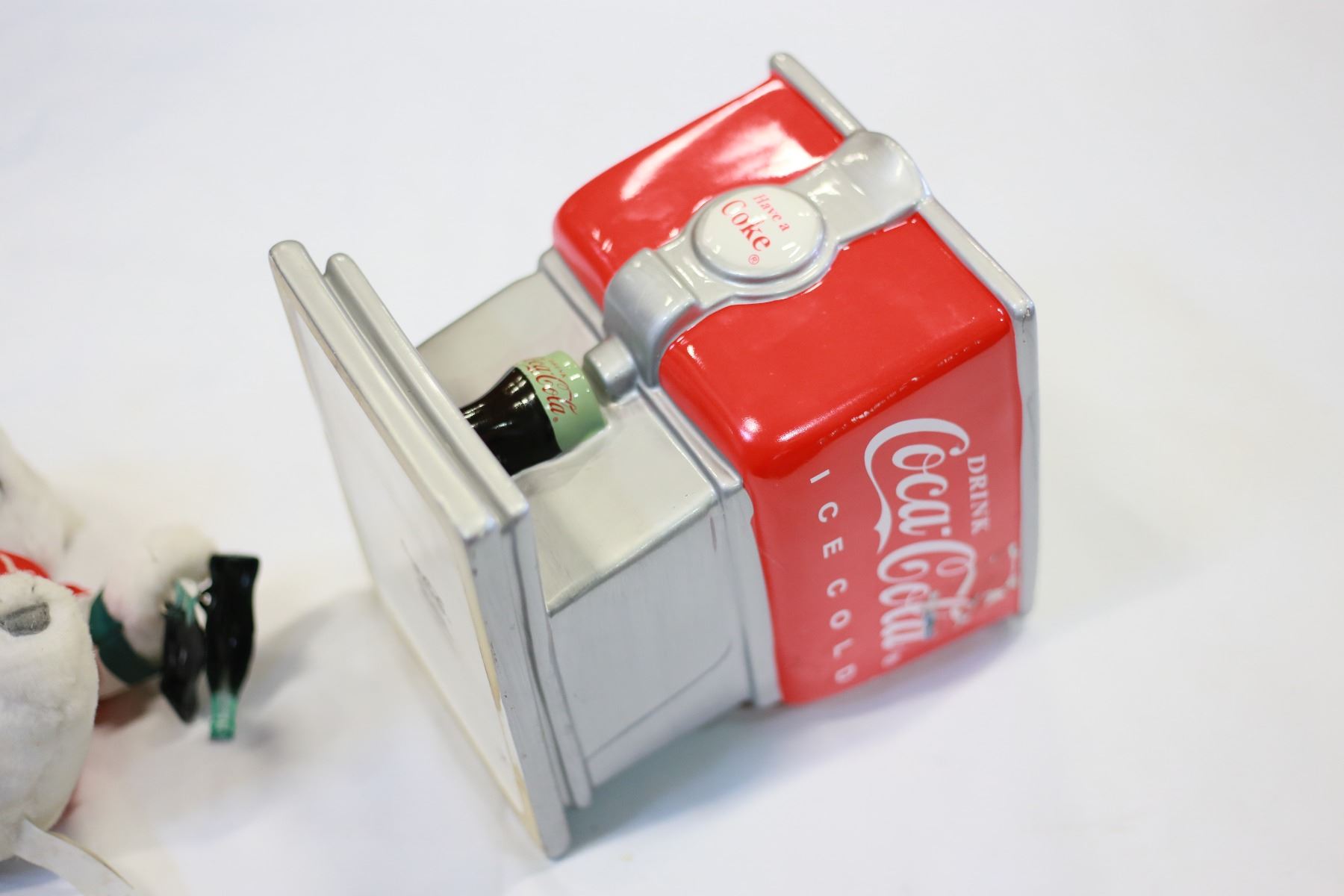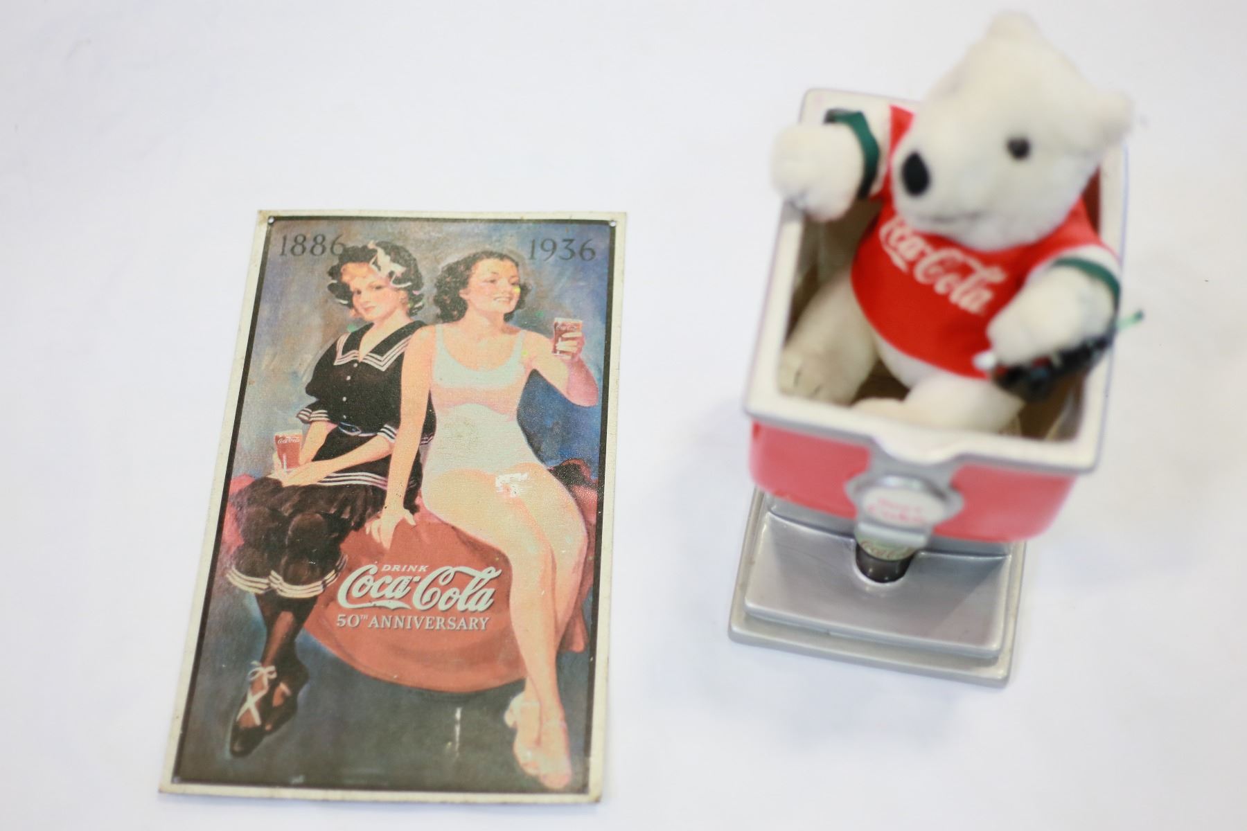 LOT OF COCA COLA COOKIE JARS JUICE JUG AND POLAR BEAR STUFFY AND 50TH ANNIVERSARY PRINT
