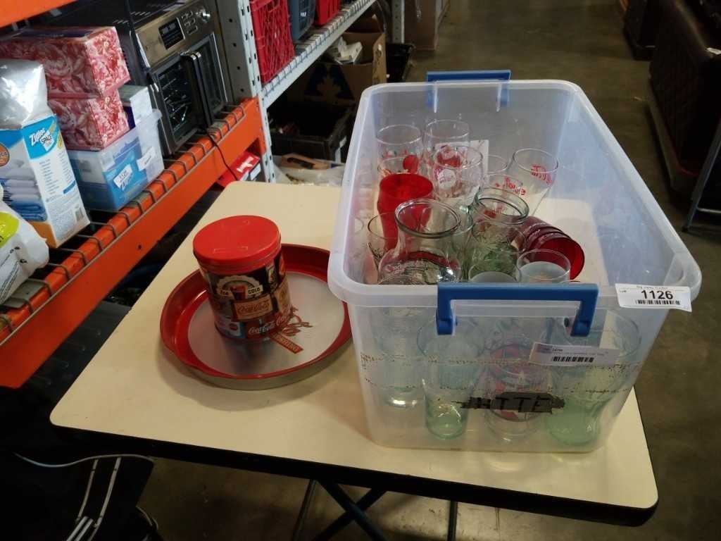 LOT OF COCA COLA GLASSES, JUG, TINS