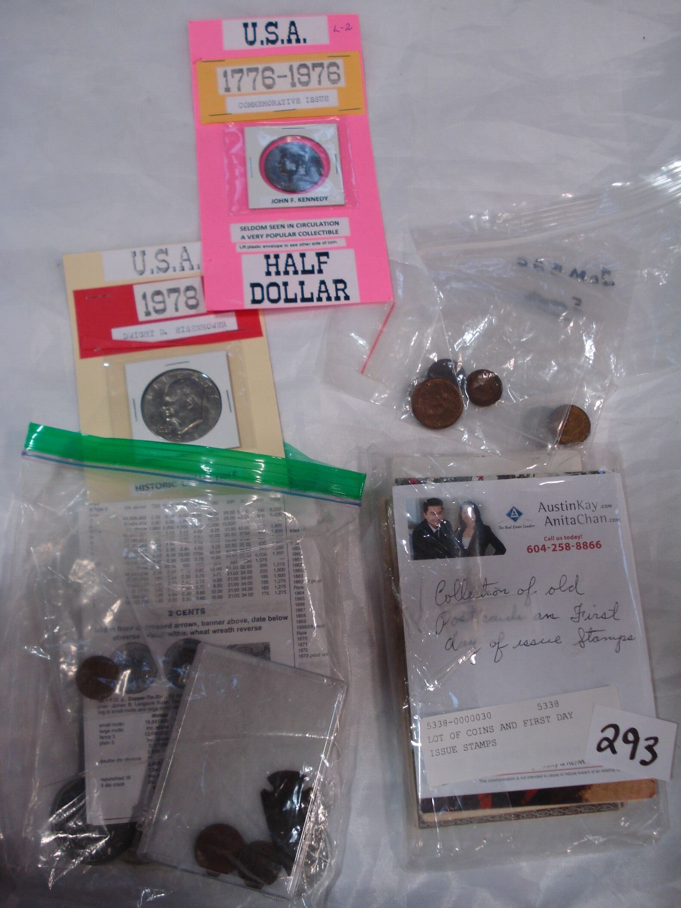 LOT OF COINS AND FIRST DAY ISSUE STAMPS