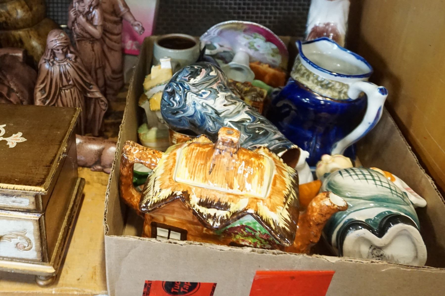 LOT OF COLLECTABLE MUGS, COTTAGE TEAPOT AND CUP SET, VASES