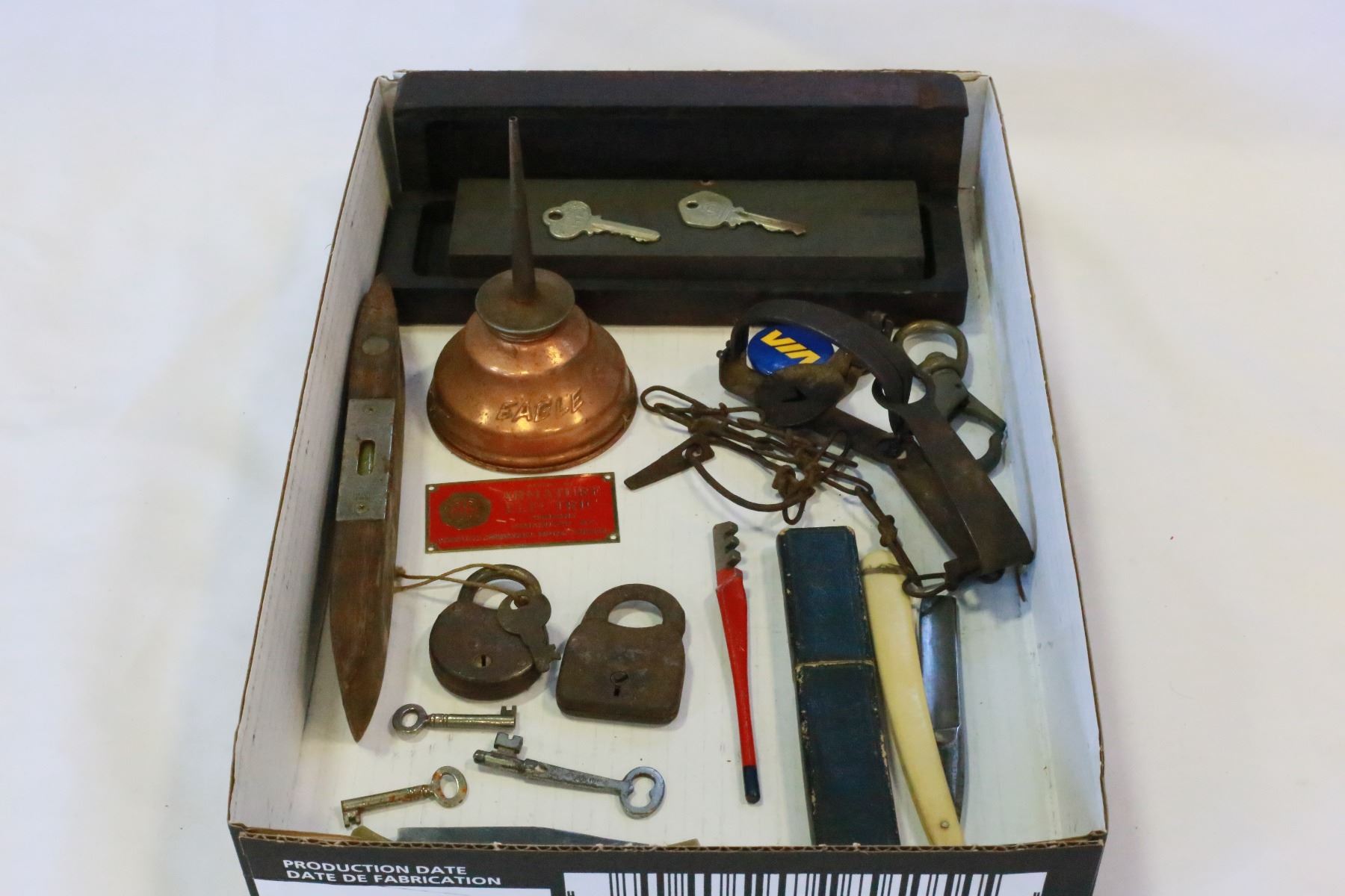LOT OF COLLECTIBLE LOCKS KEYS AND COPPER OIL CAN