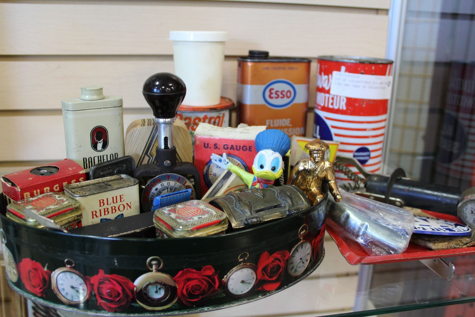 LOT OF COLLECTIBLE OIL AND GAS TINS AND TRAY OF COLLECTIBLES