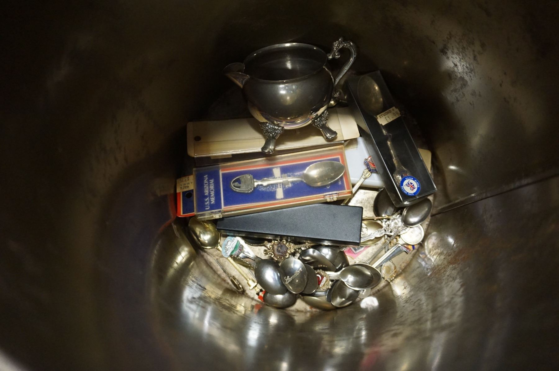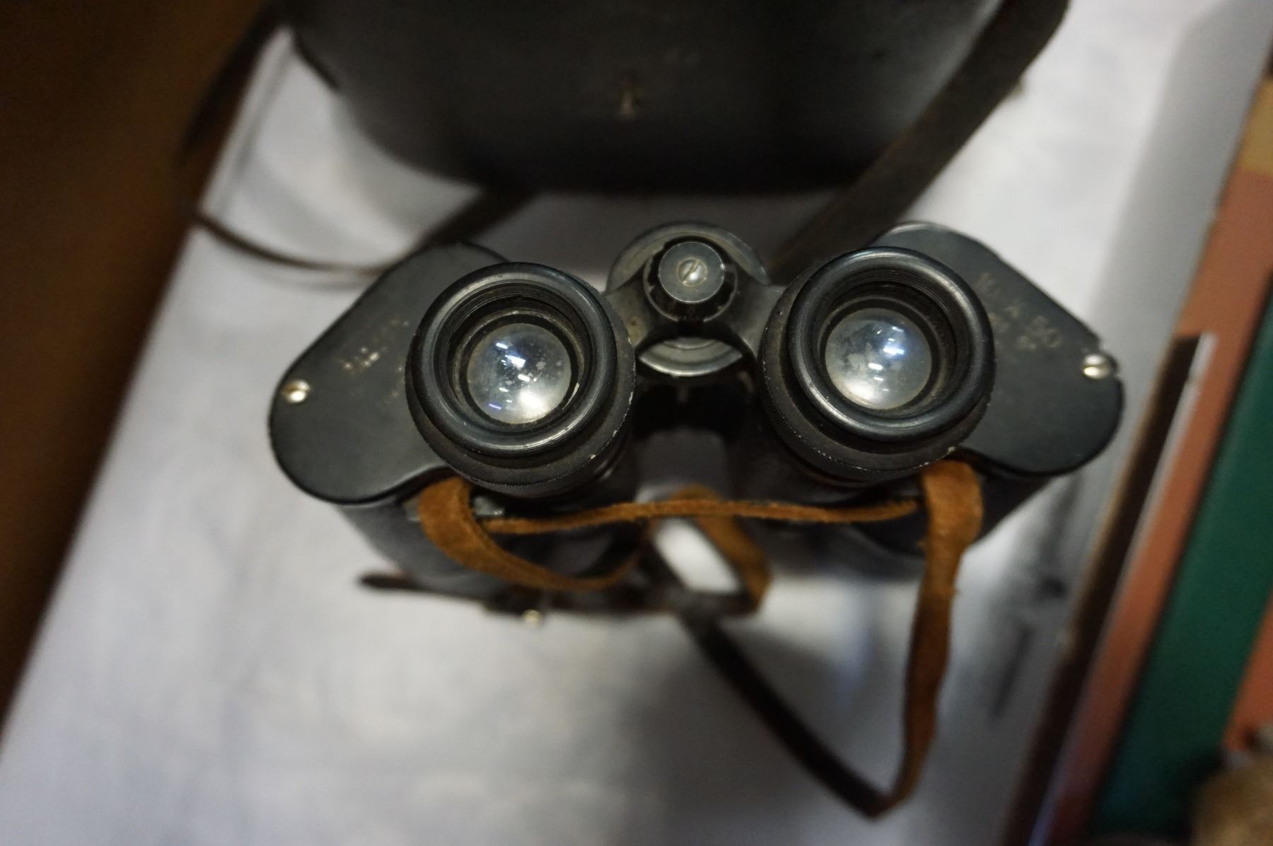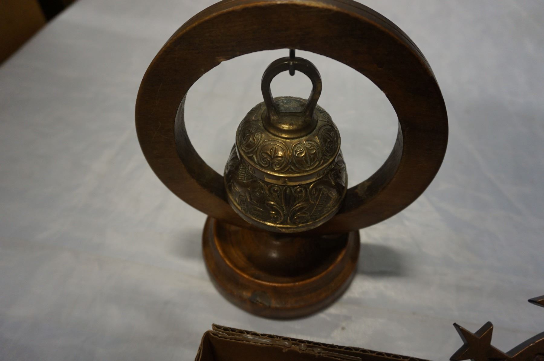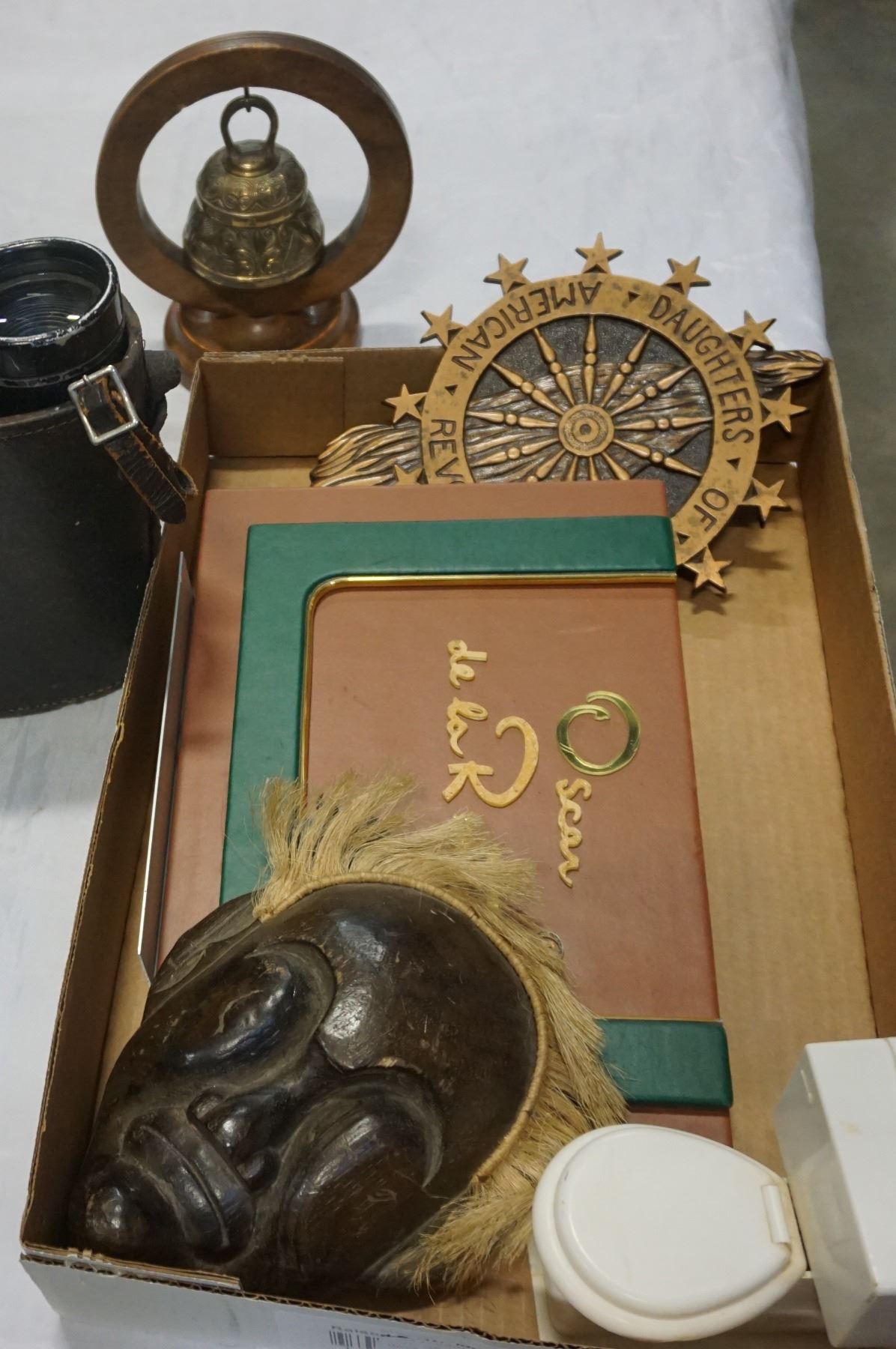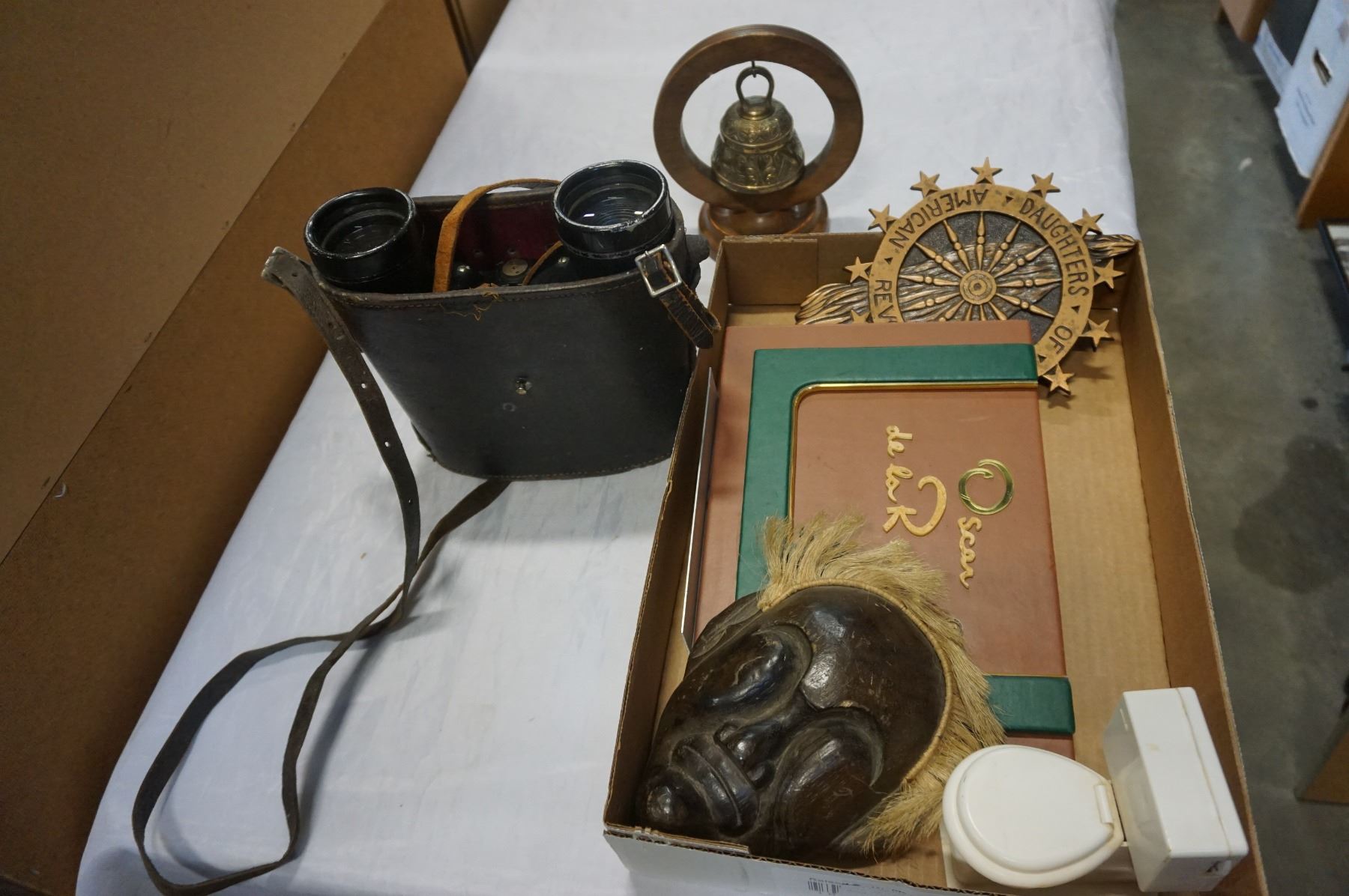 LOT OF COLLECTIBLES, BRASS BELL, BINOCULARS, TOILET RADIO