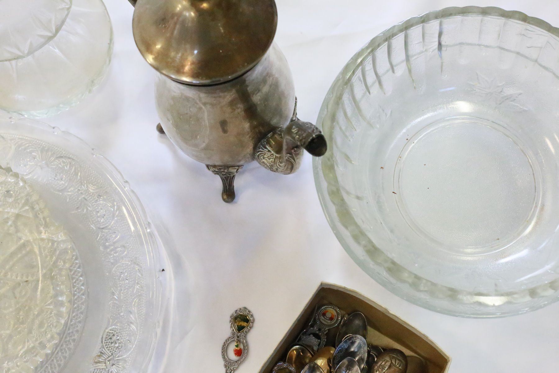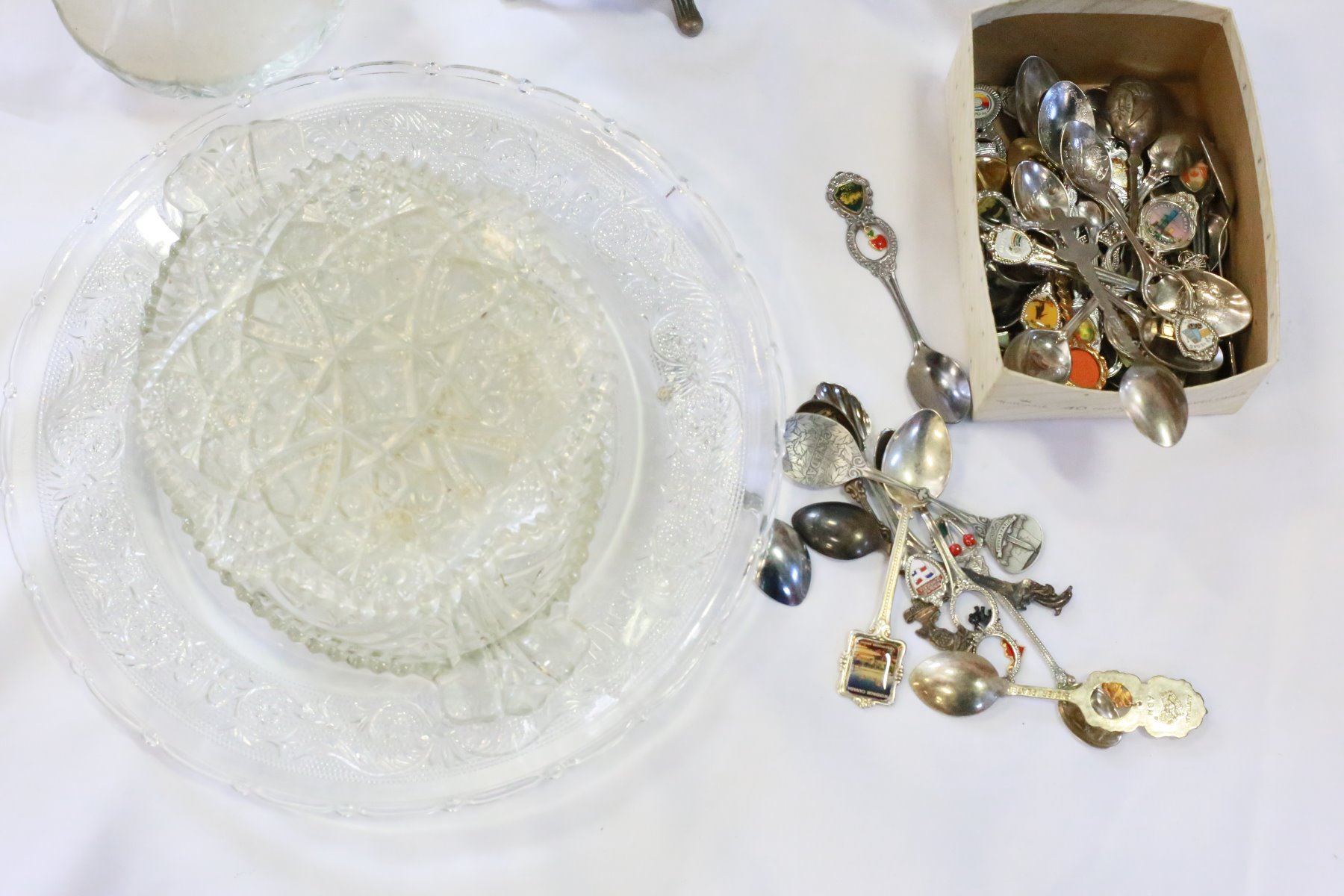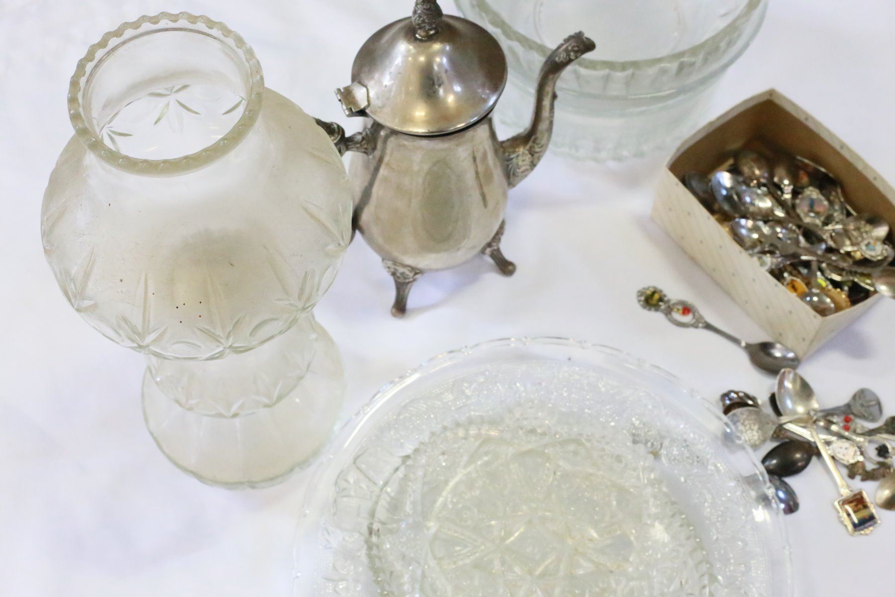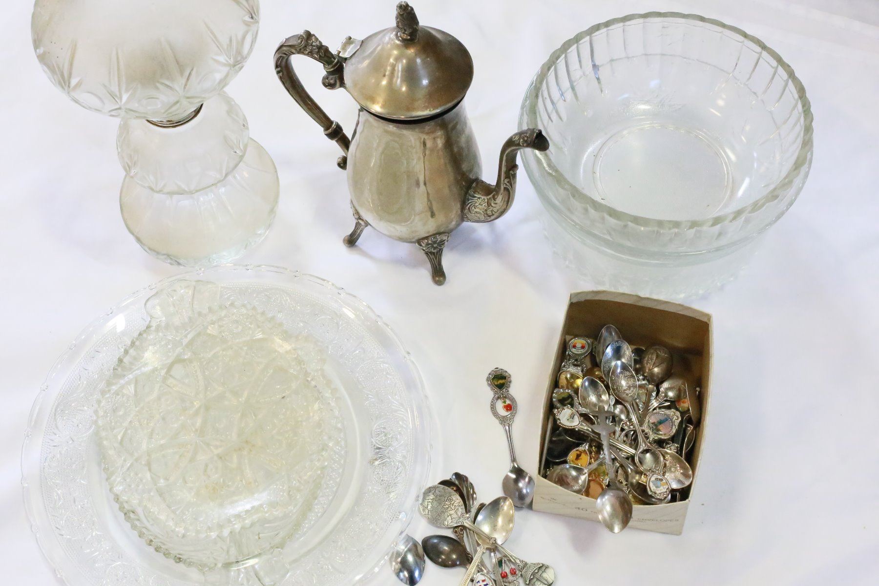 LOT OF CRYSTAL SERVING PIECES AND LANTERN AND SILVE TEAPOT AND SPOONS