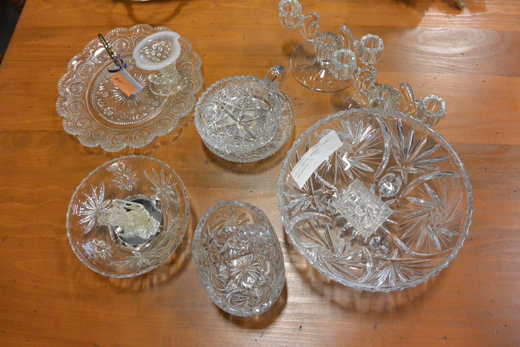 LOT OF CRYSTAL SERVING PIECES CANDLESTICKS ETC