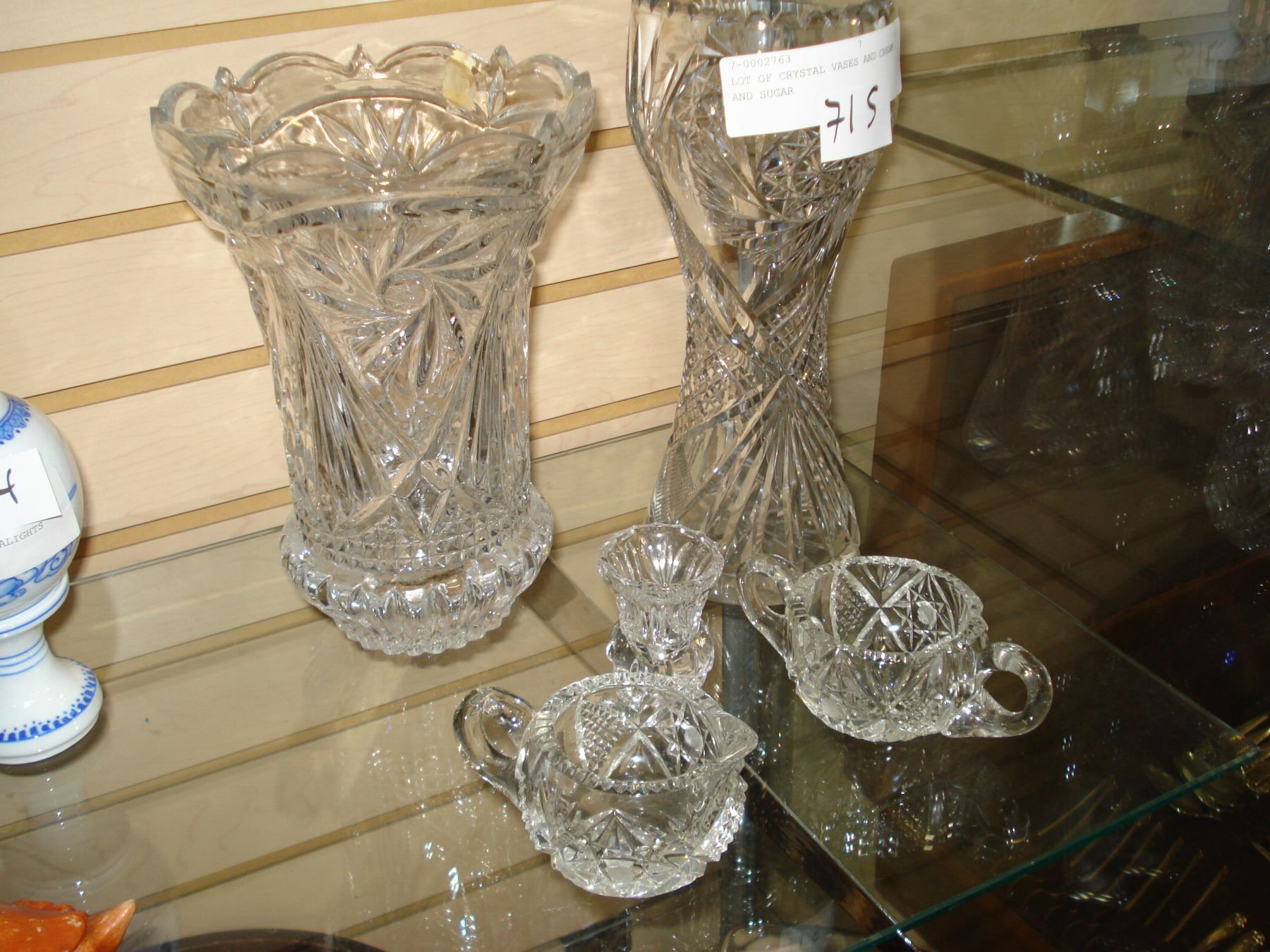 LOT OF CRYSTAL VASES AND CREAM AND SUGAR