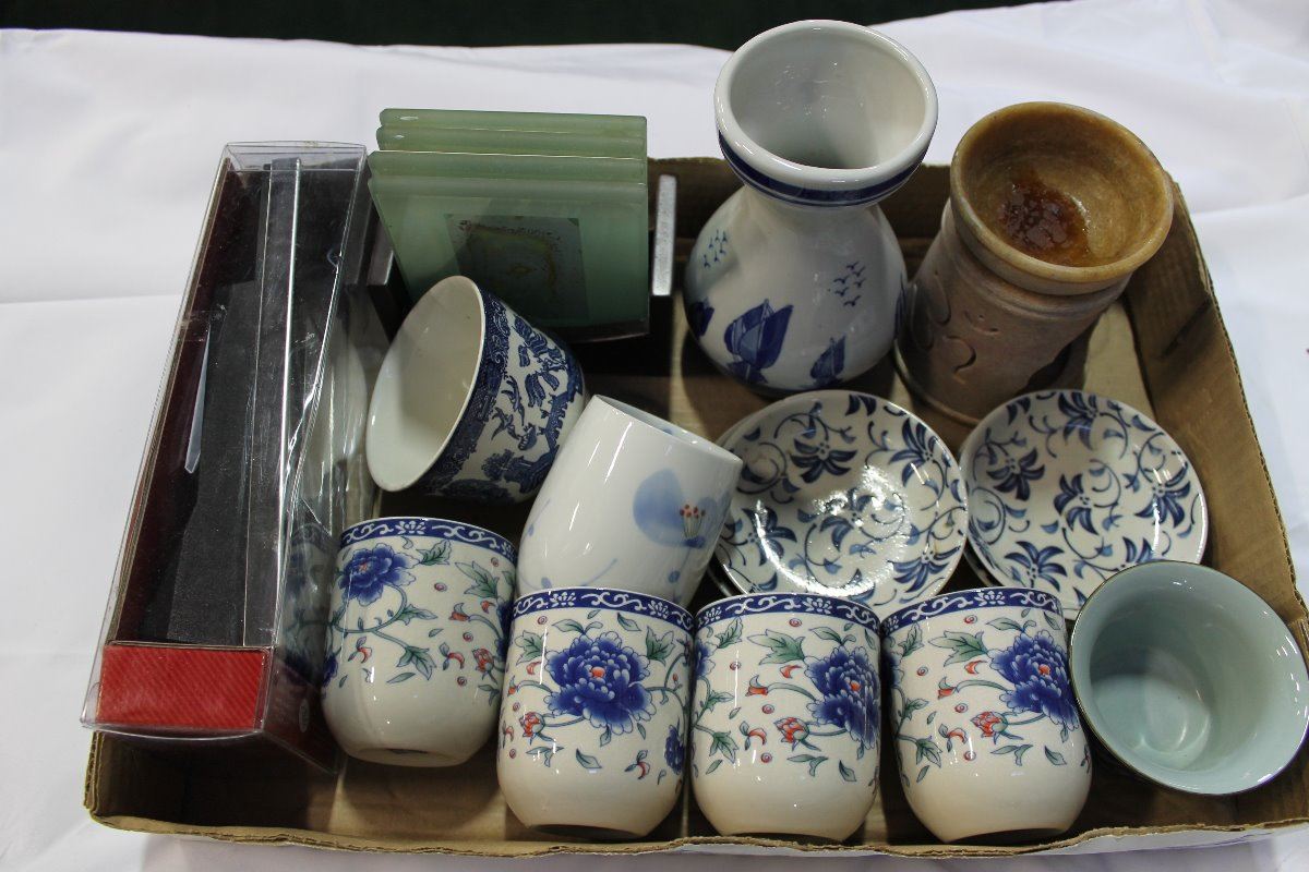 LOT OF CUPS,SAUCERS,COASTERS,CLOCK