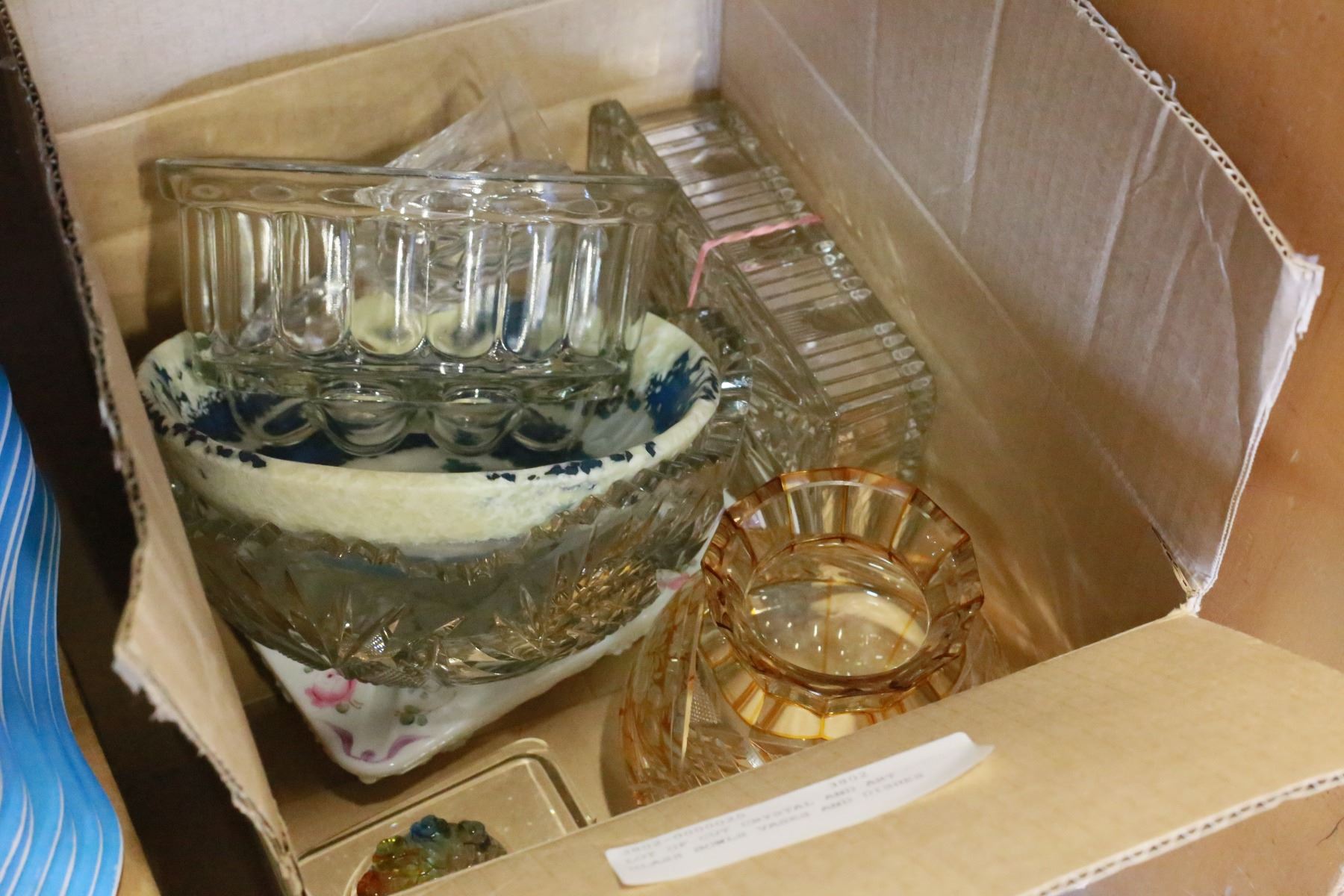 LOT OF CUT CRYSTAL AND ART GLASS BOWLS VASES AND DISHES