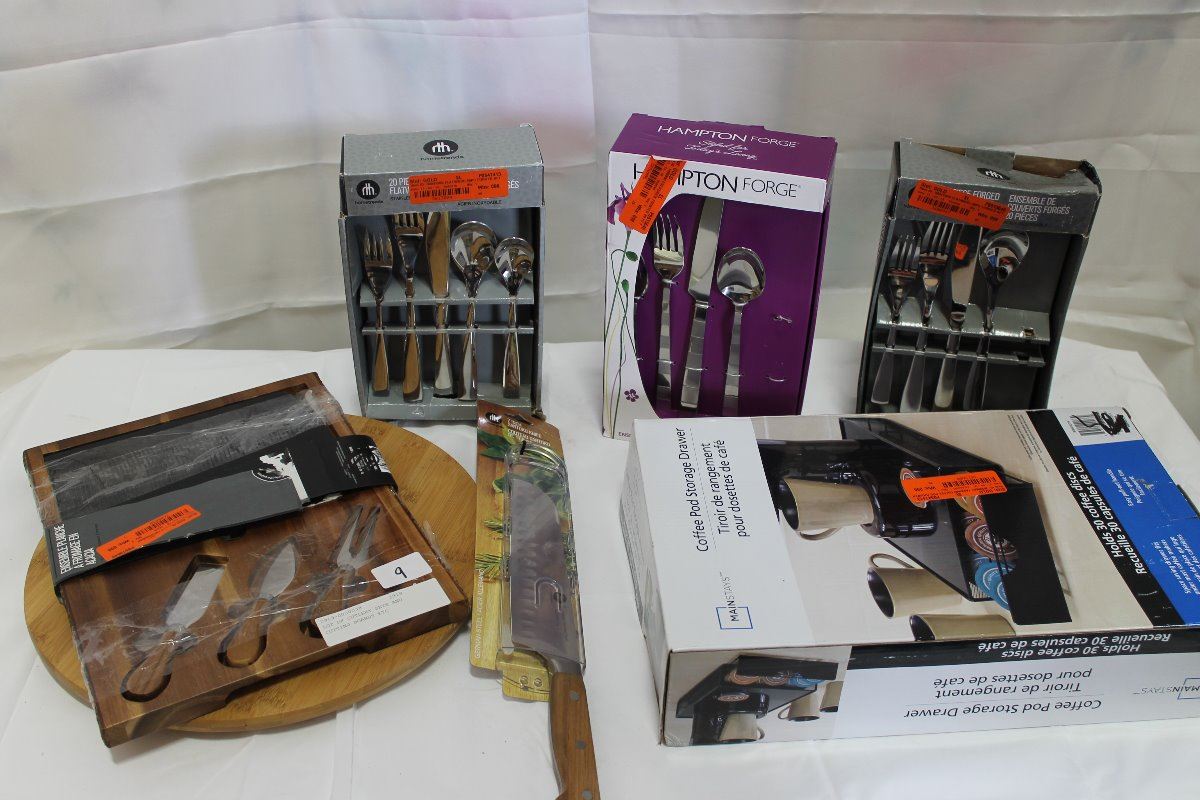 LOT OF CUTLERY SETS AND CUTTING BOARDS ETC