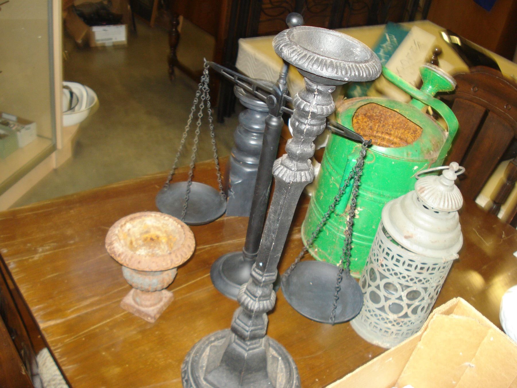 LOT OF DECORATIVE CAST IRON WATER CAN AND BALANCE SCALE