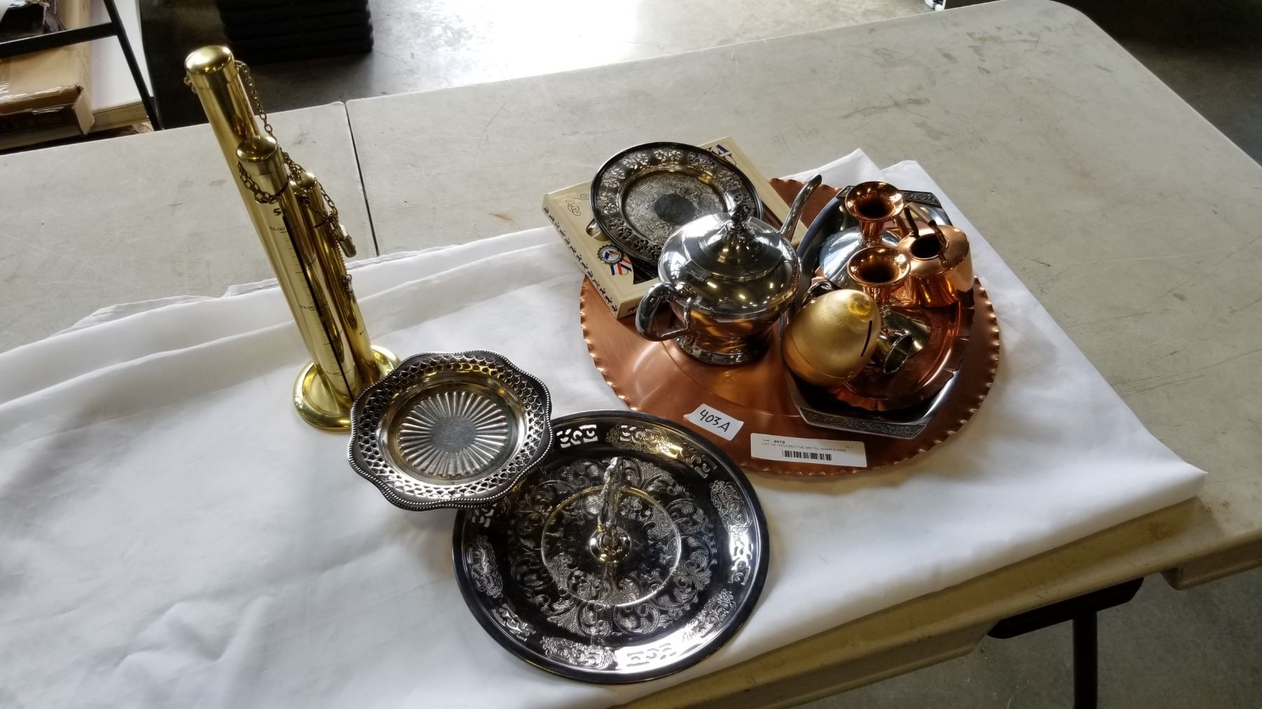 LOT OF DECORATIVE METAL WARES AND ULU KNIFE