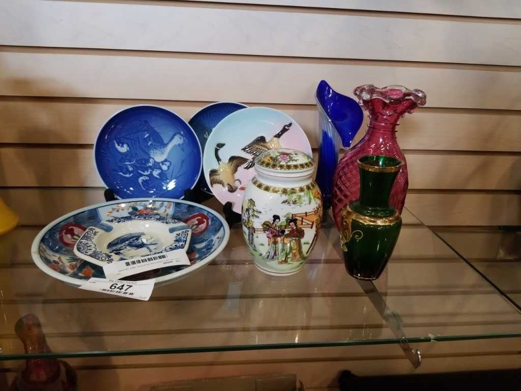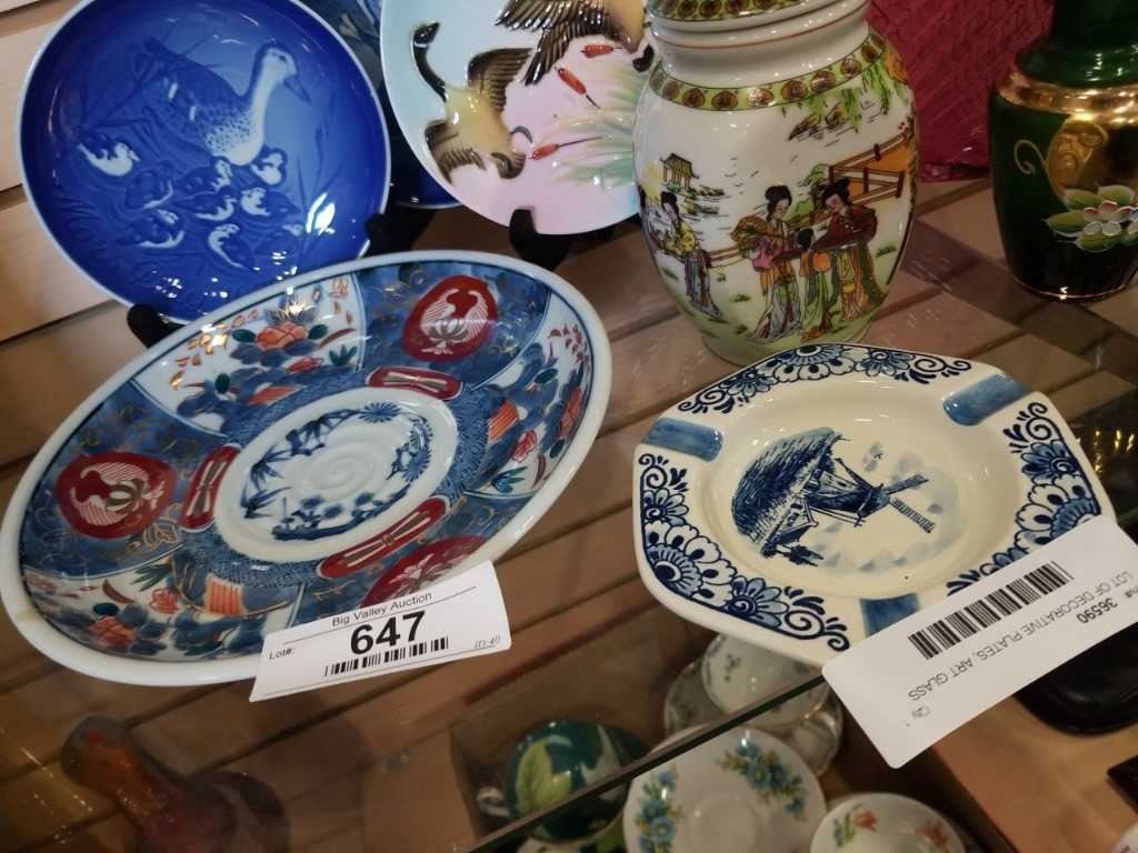 LOT OF DECORATIVE PLATES, ART GLASS VASES, AND ORIENTAL VASE