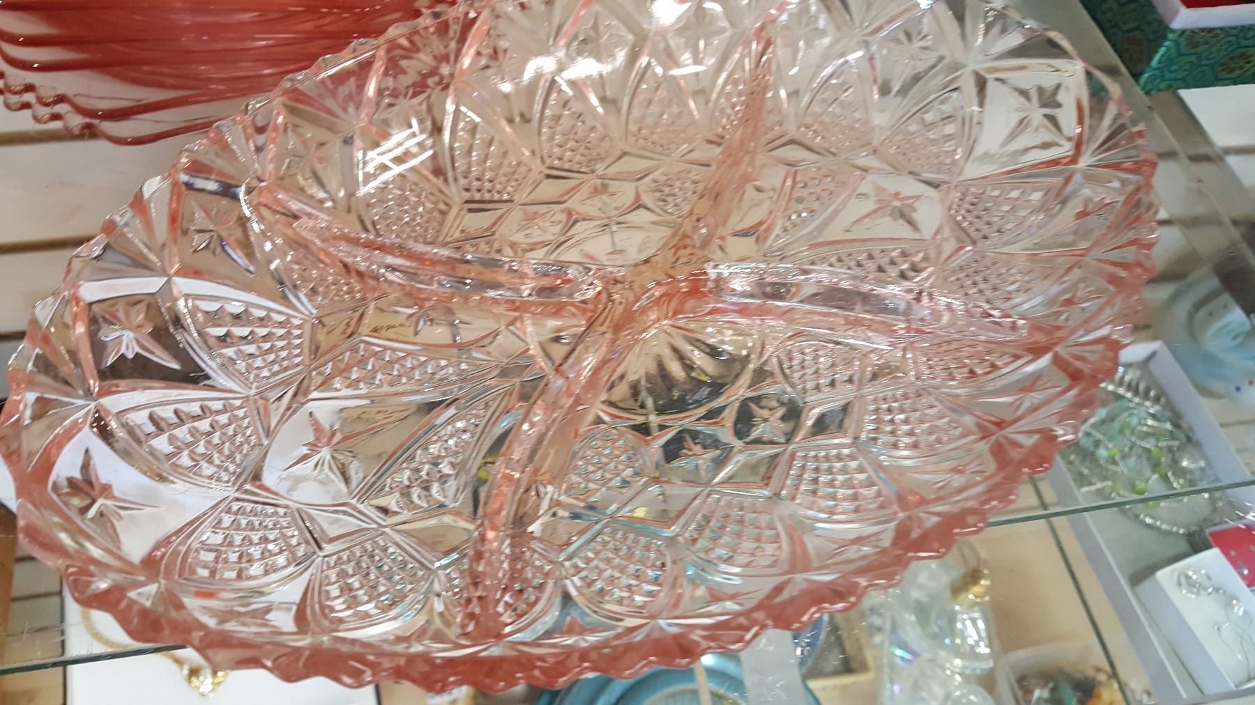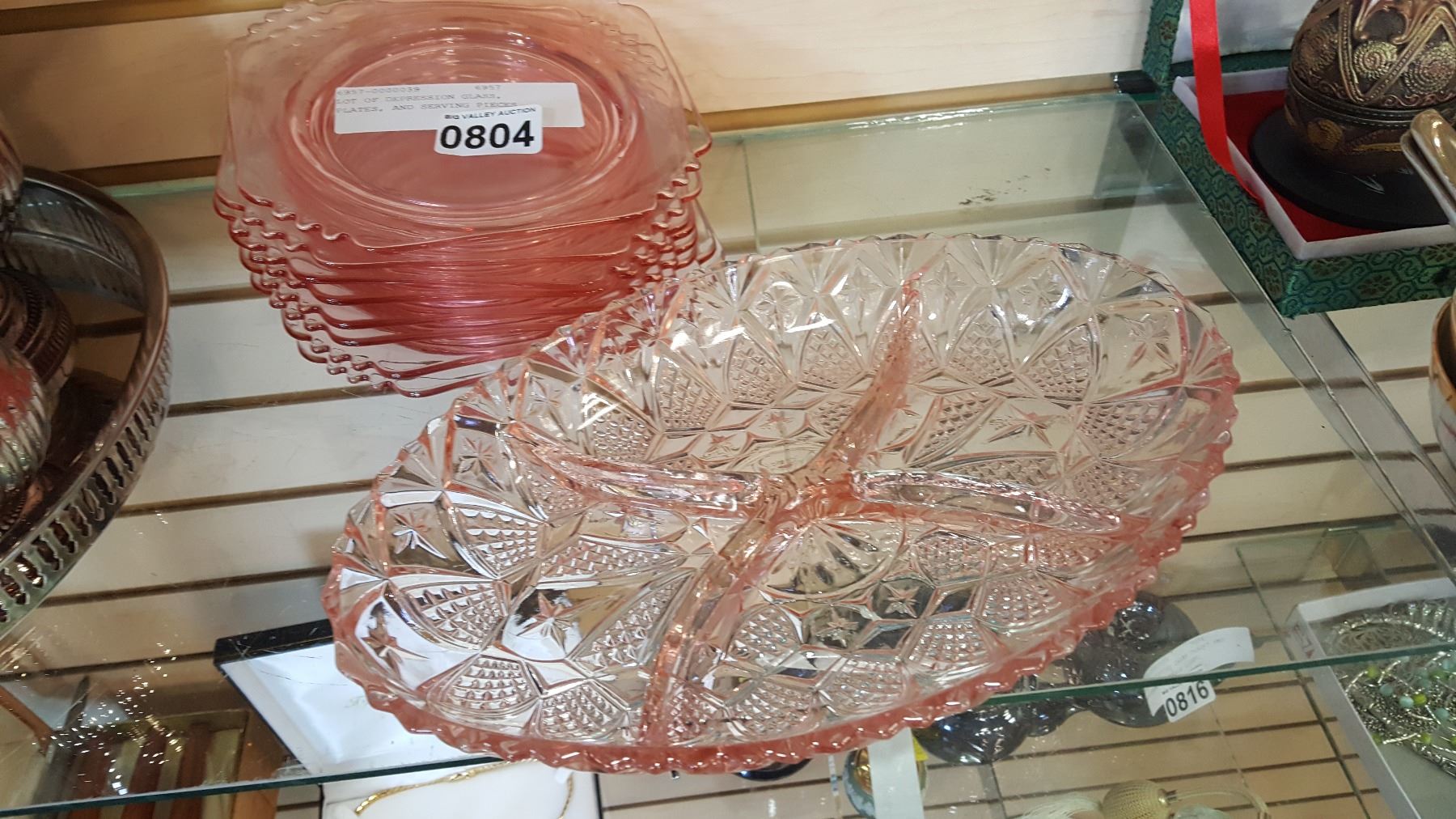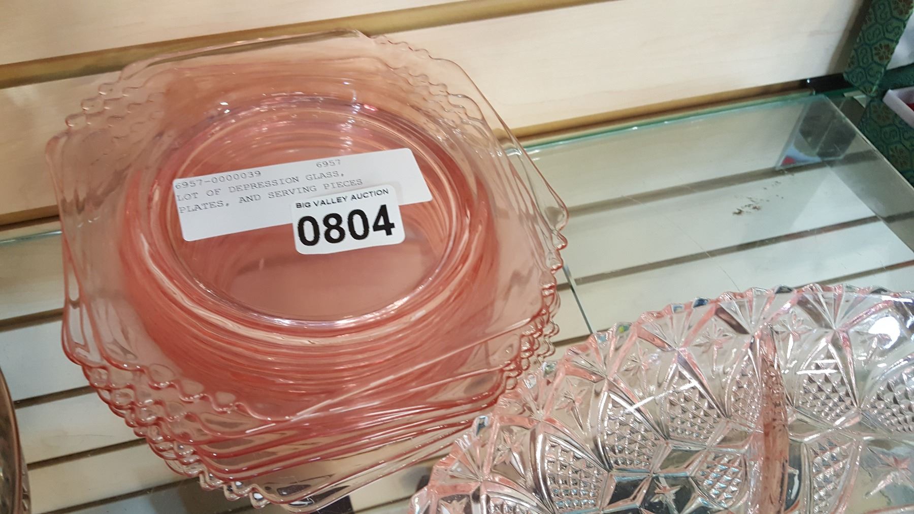 LOT OF DEPRESSION GLASS, PLATES, AND SERVING PIECES