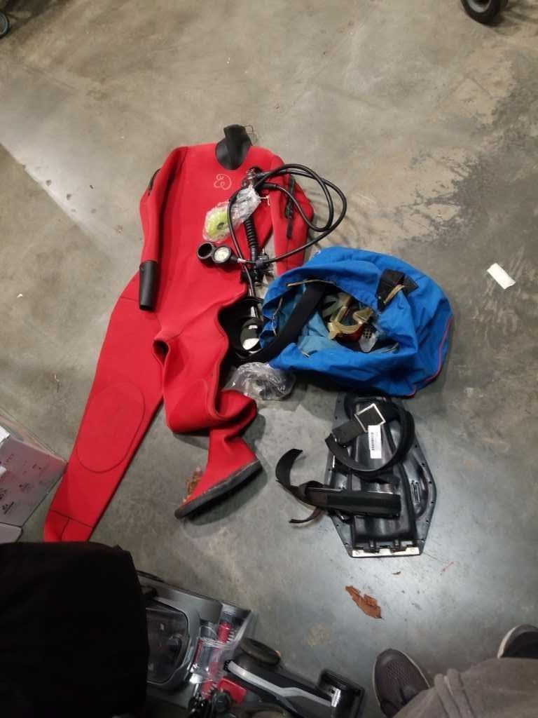LOT OF DIVING EQUIPMENT, WEIGHTS, WETSUIT, REGULATORS ETC
