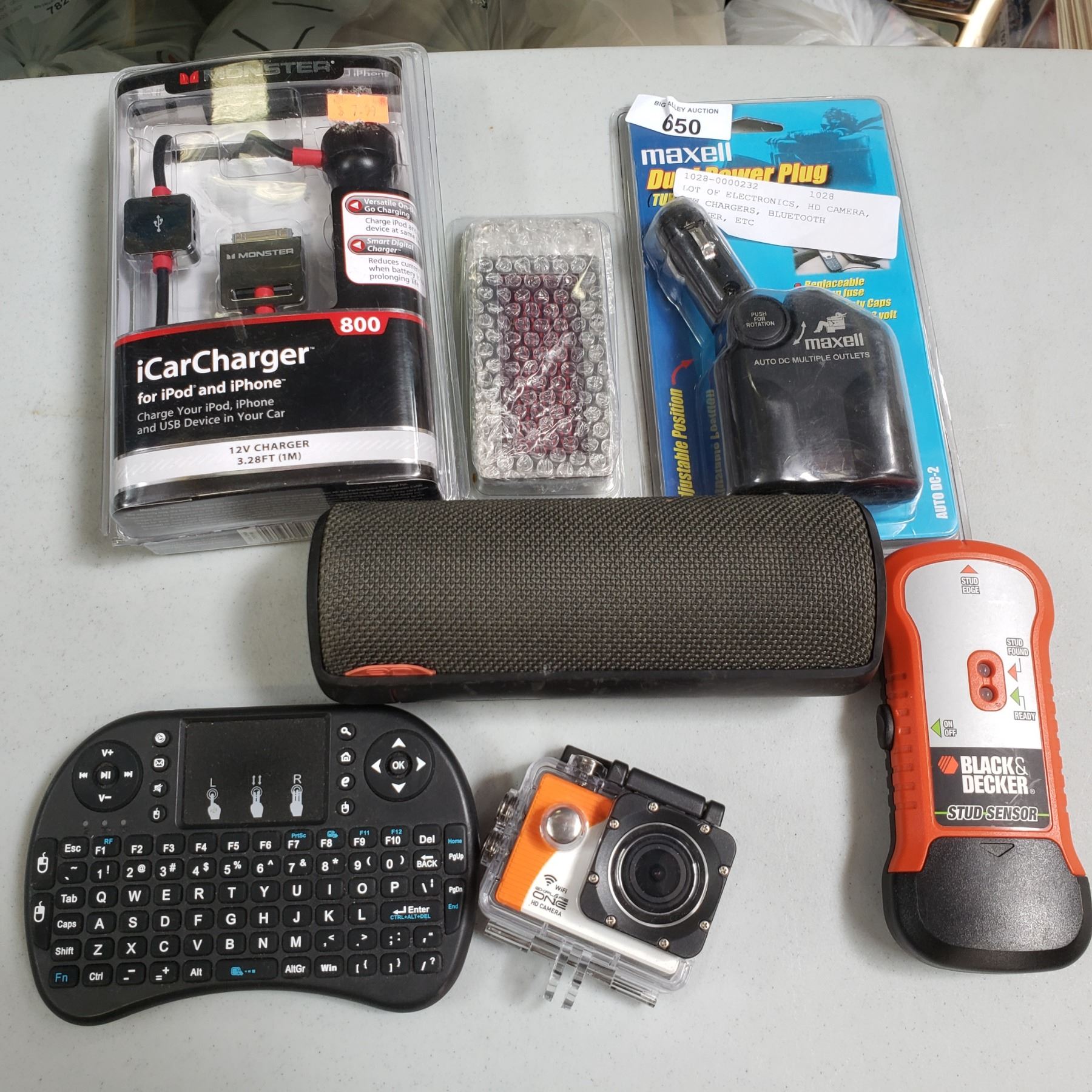 LOT OF ELECTRONICS, HD CAMERA, NEW CHARGERS, BLUETOOTH SPEAKER, ETC