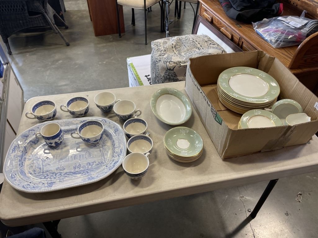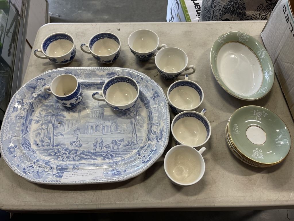 LOT OF ENGLISH CHINA AND BLUE WILLOW PLATTER ANS CUPS