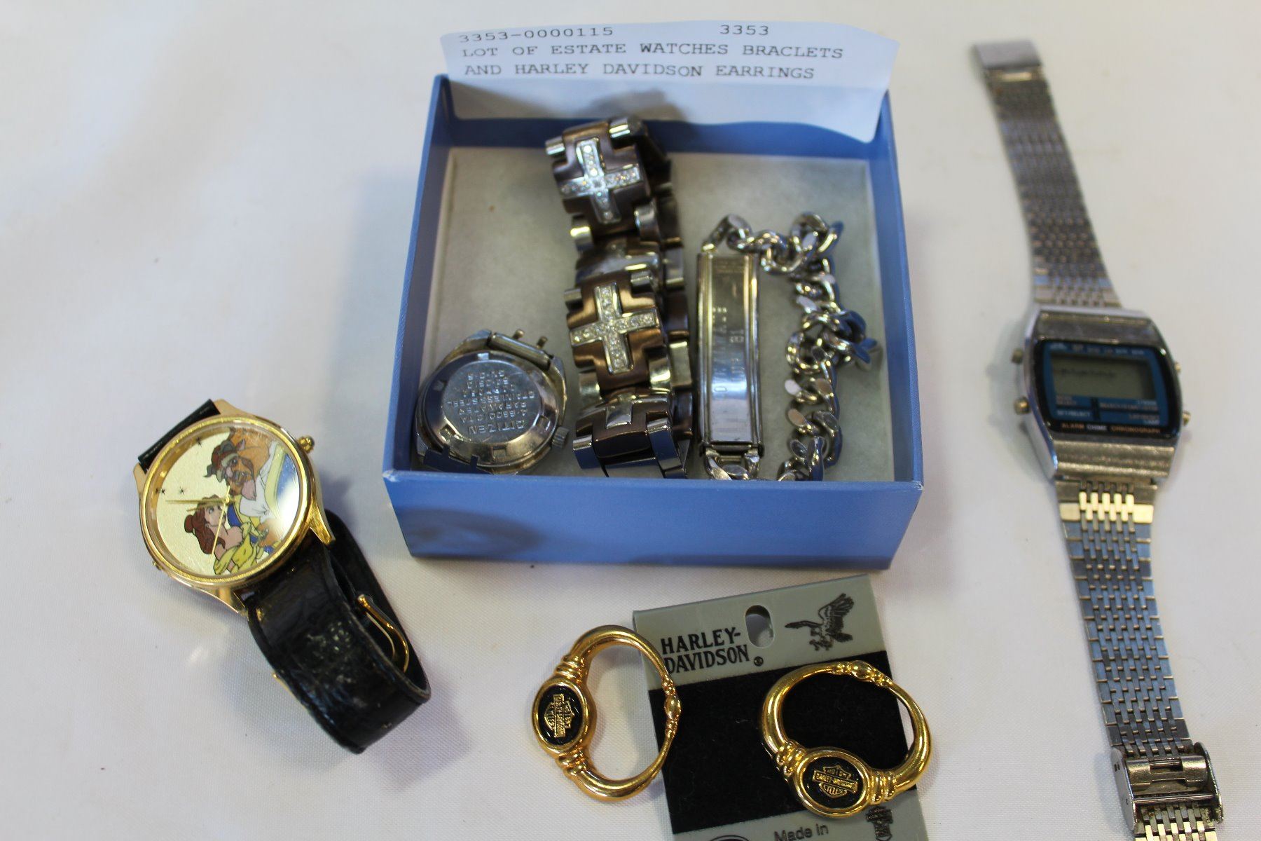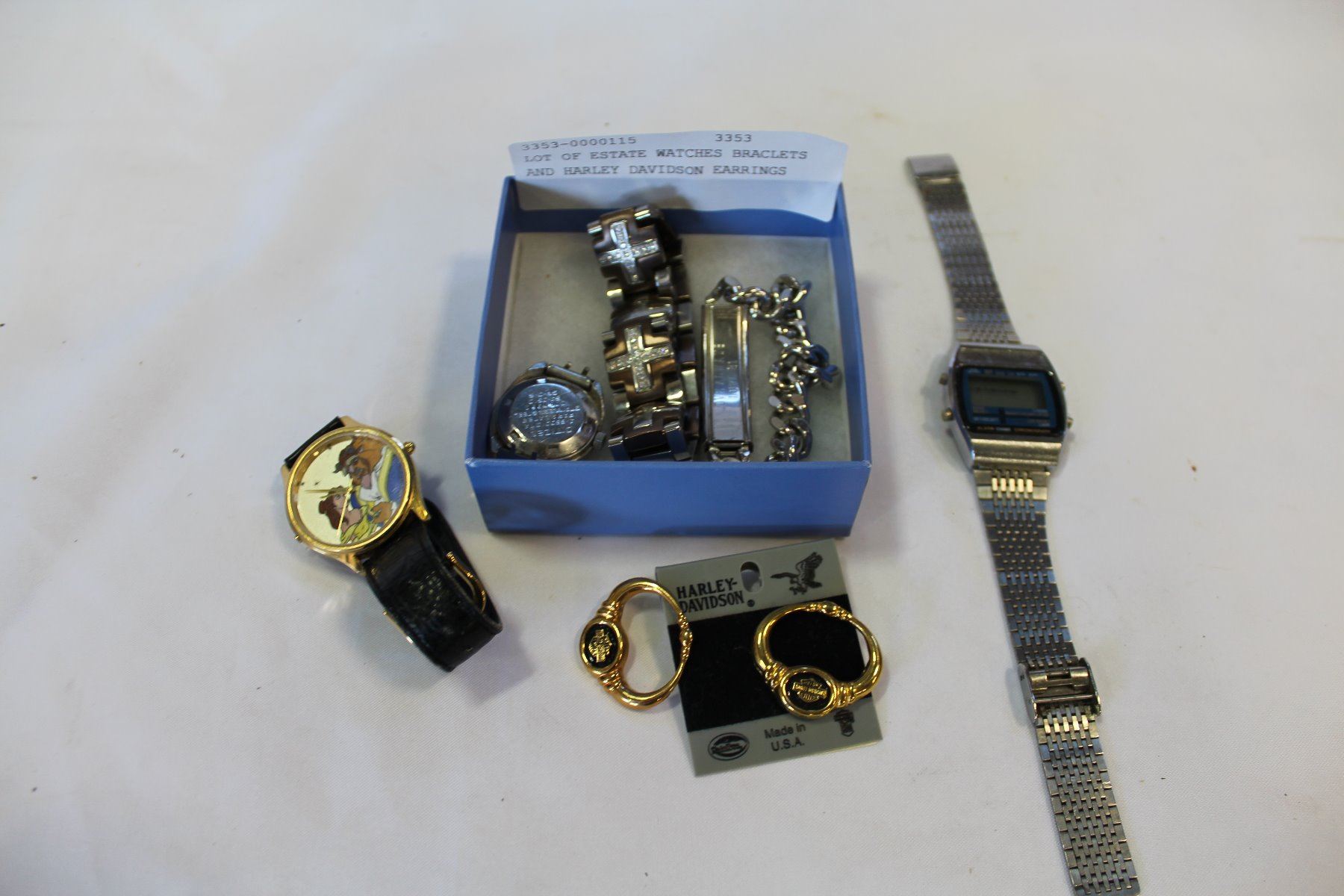 LOT OF ESTATE WATCHES BRACLETS AND HARLEY DAVIDSON EARRINGS