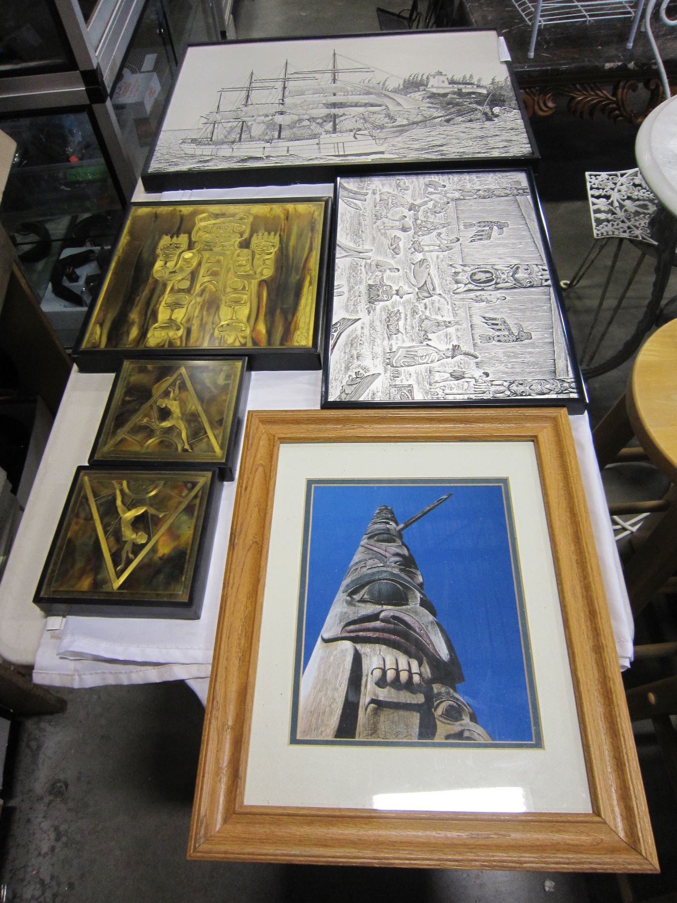 LOT OF ETCHED ART AND FIRST NATIONS TOTEM POLE PICTURE