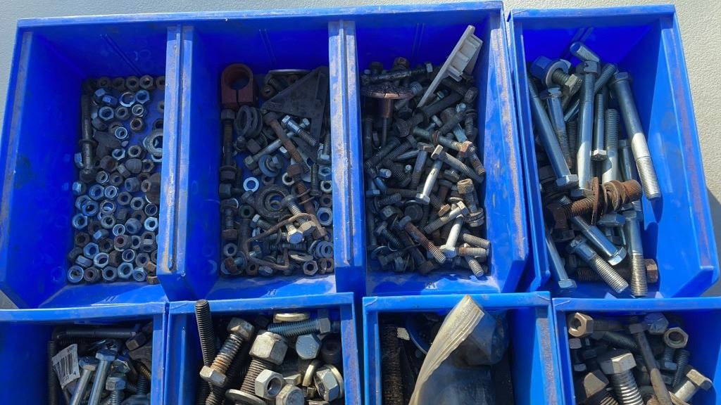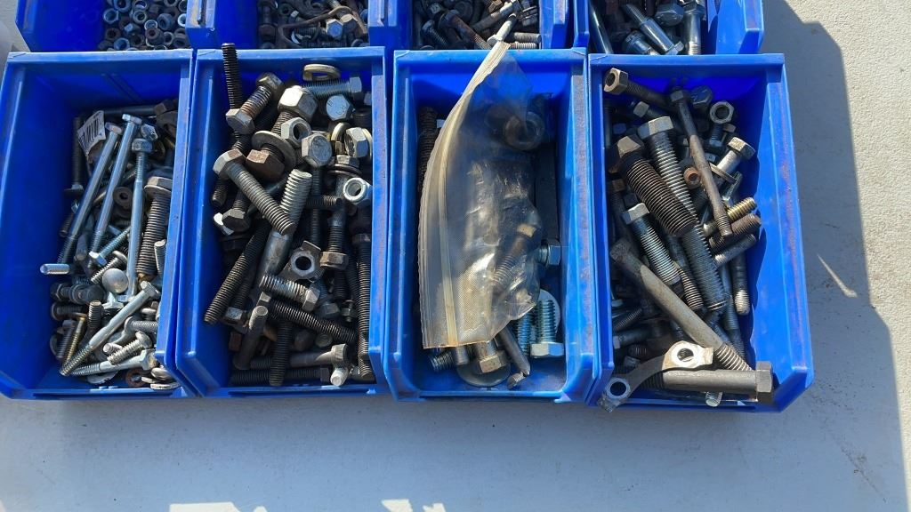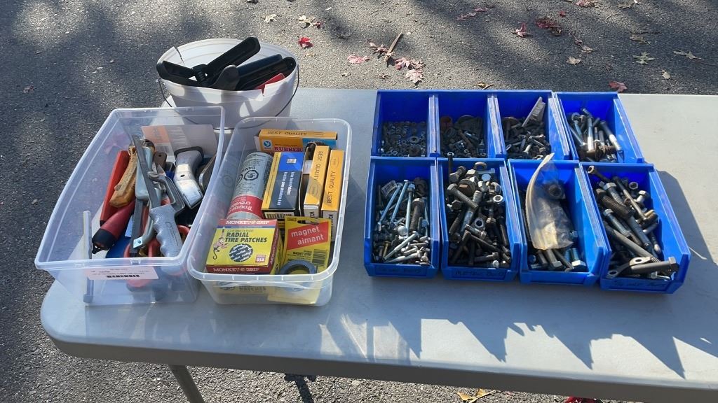 LOT OF FASTENERS, CLAMPS, TIRE PATCHES, SCISSORS AND MORE