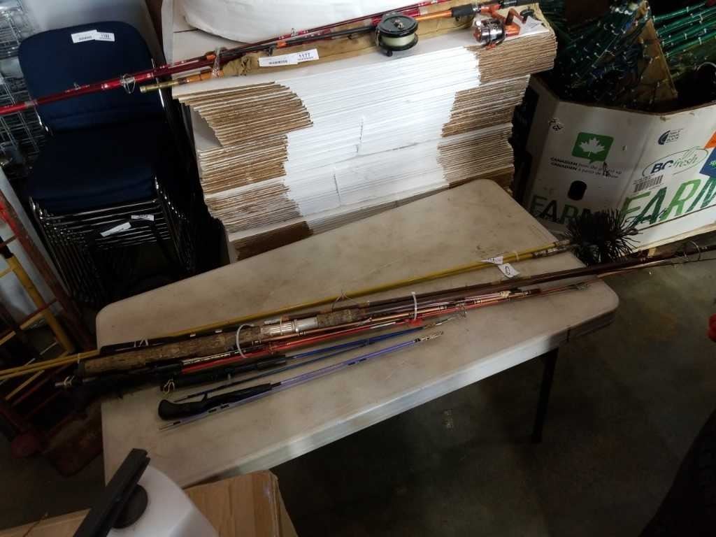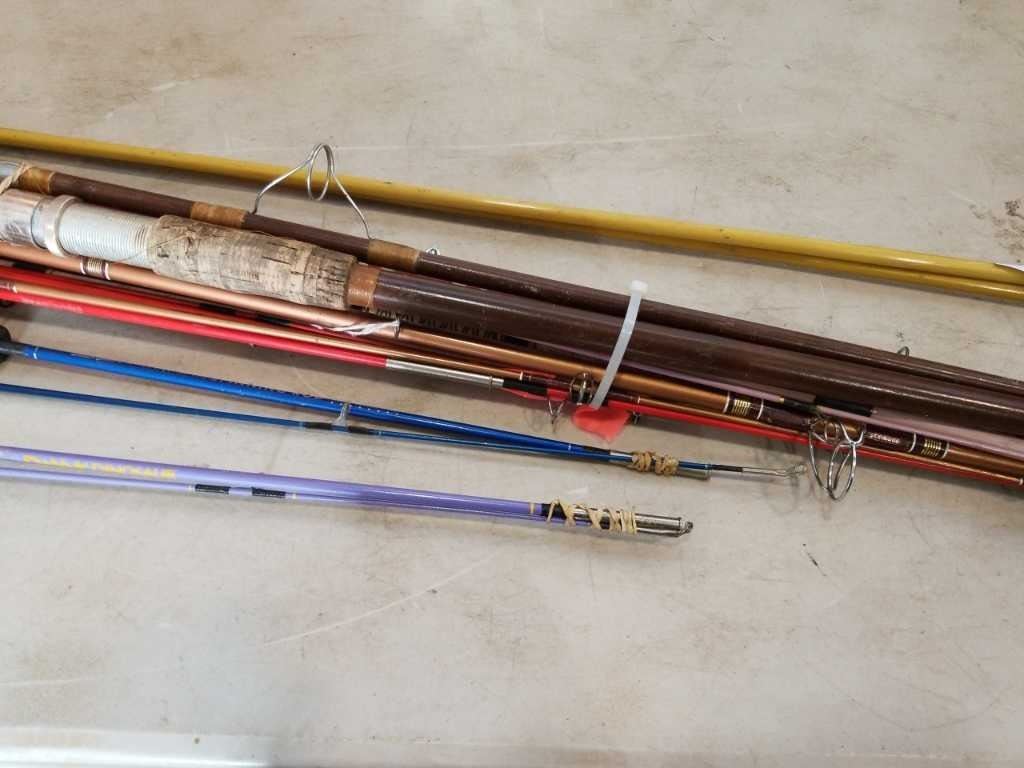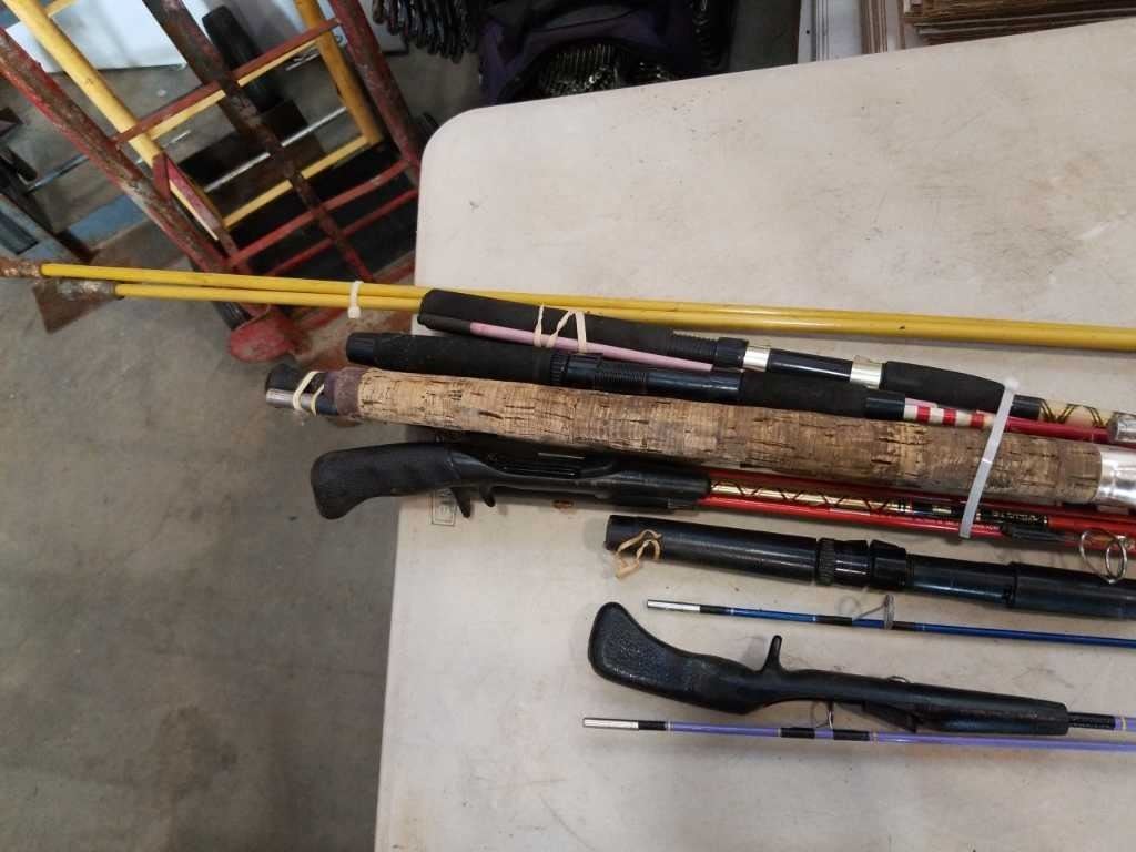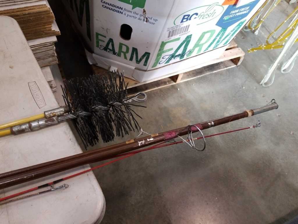 LOT OF FISHING RODS AND CHUMNEY BROOM