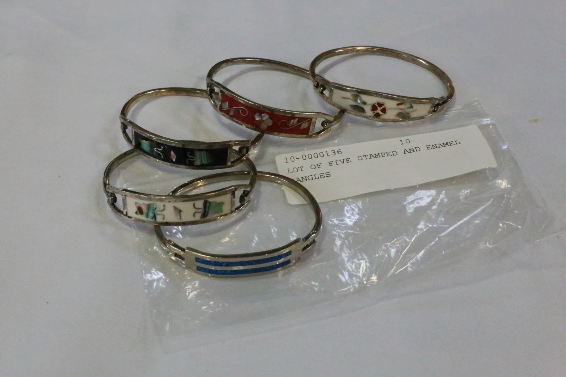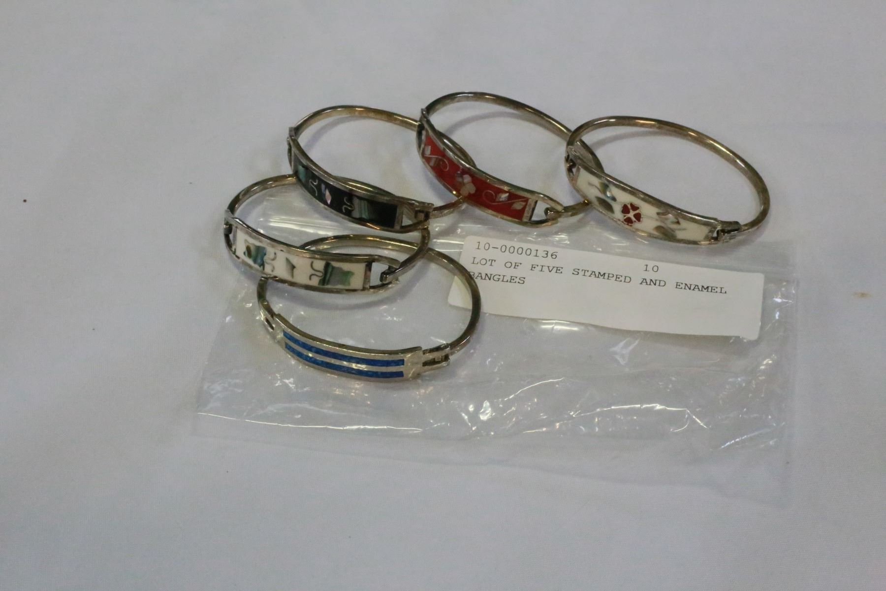 LOT OF FIVE STAMPED AND ENAMEL BANGLES