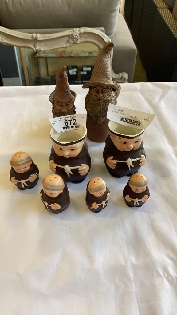 LOT OF FRIAR CREAMS, SALT AND PEPPERS AND WIZARD CANDLE HOLDERS