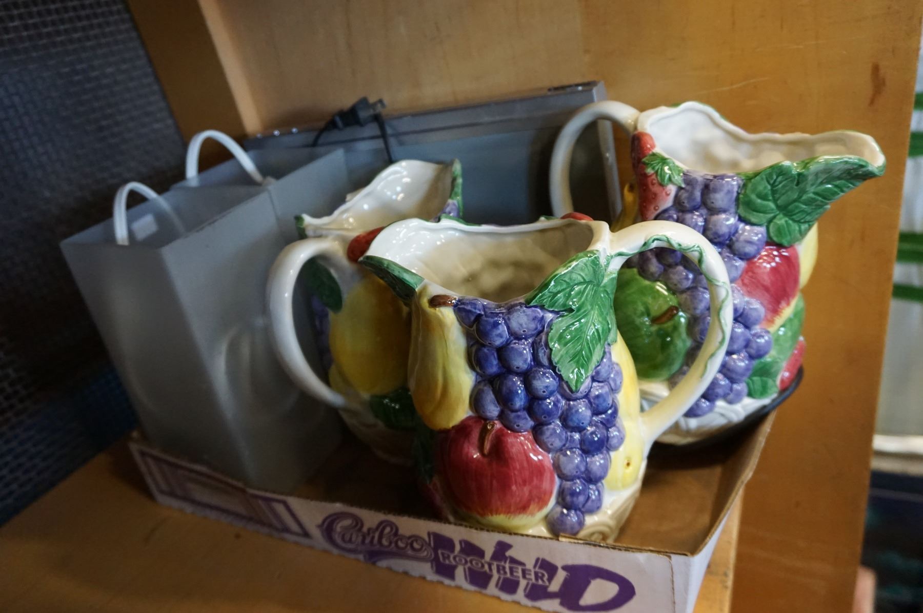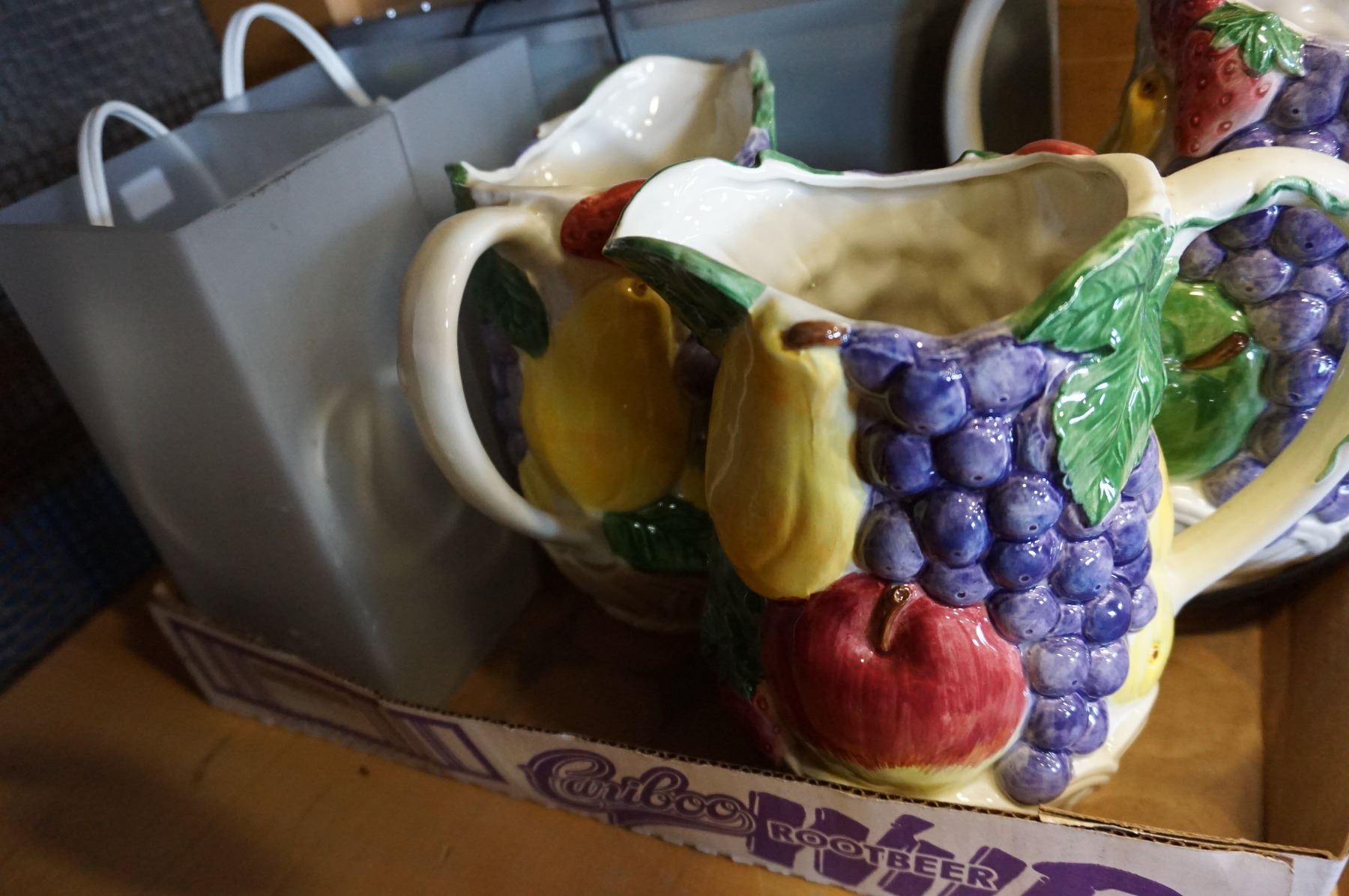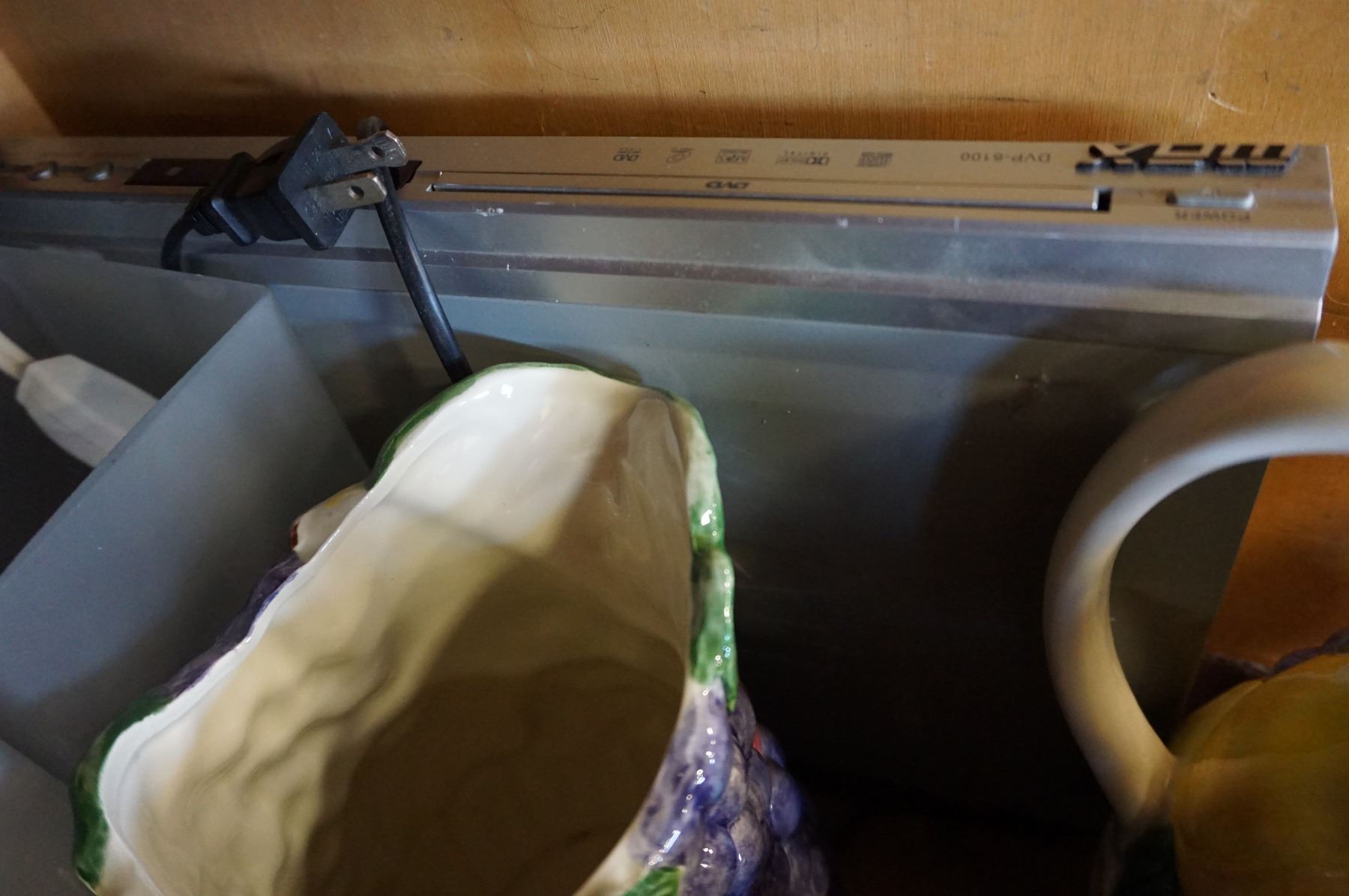 LOT OF FRUIT BASKET PITCHERS, DVD PLAYER, AND LAMPS