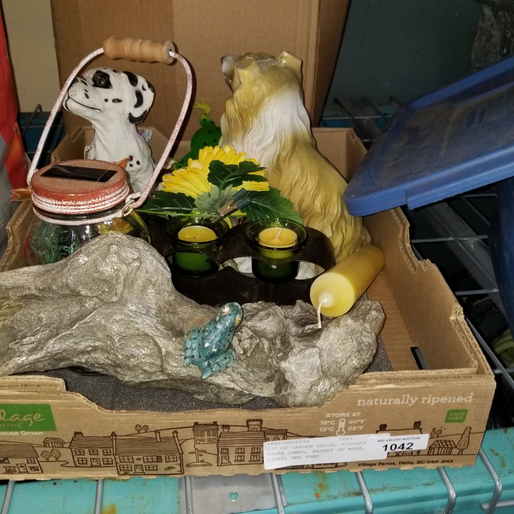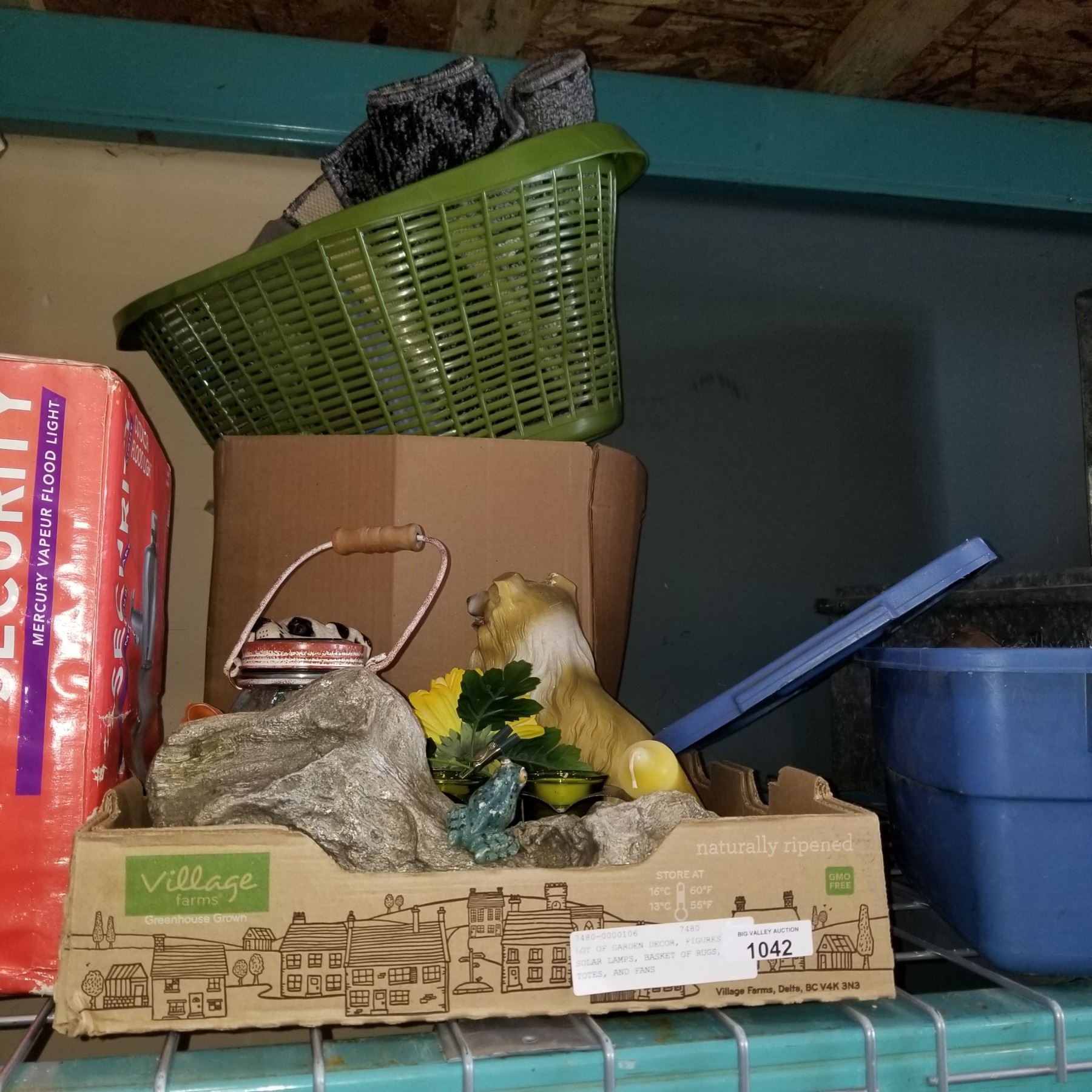 LOT OF GARDEN DECOR, FIGURES, SOLAR LAMPS, BASKET OF RUGS, TOTES, AND FANS