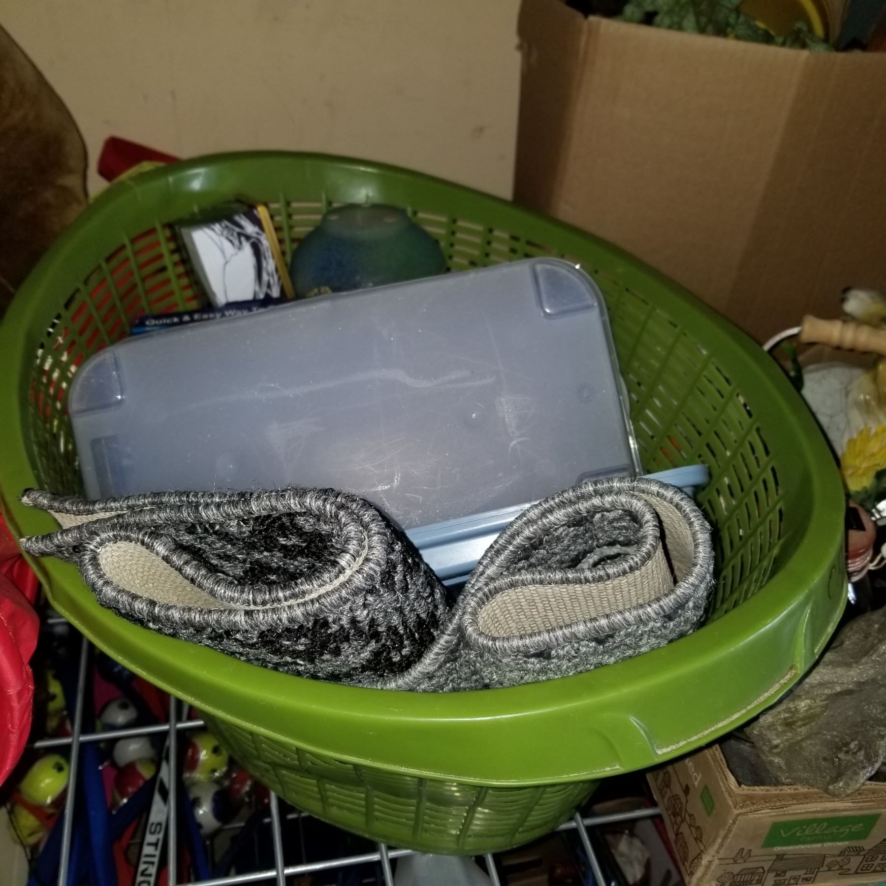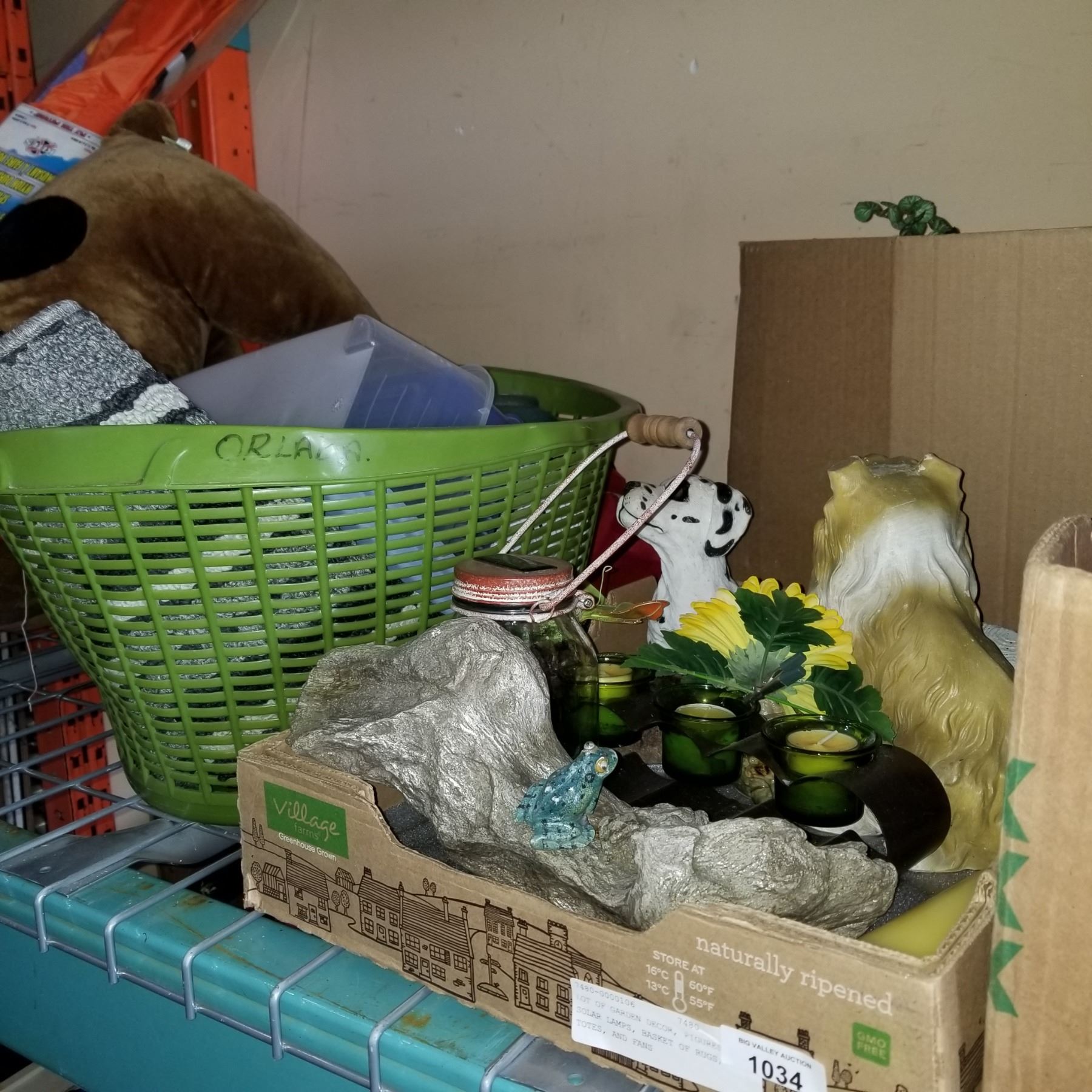 LOT OF GARDEN DECOR, FIGURES, SOLAR LAMPS, BASKET OF RUGS, TOTES, AND FANS