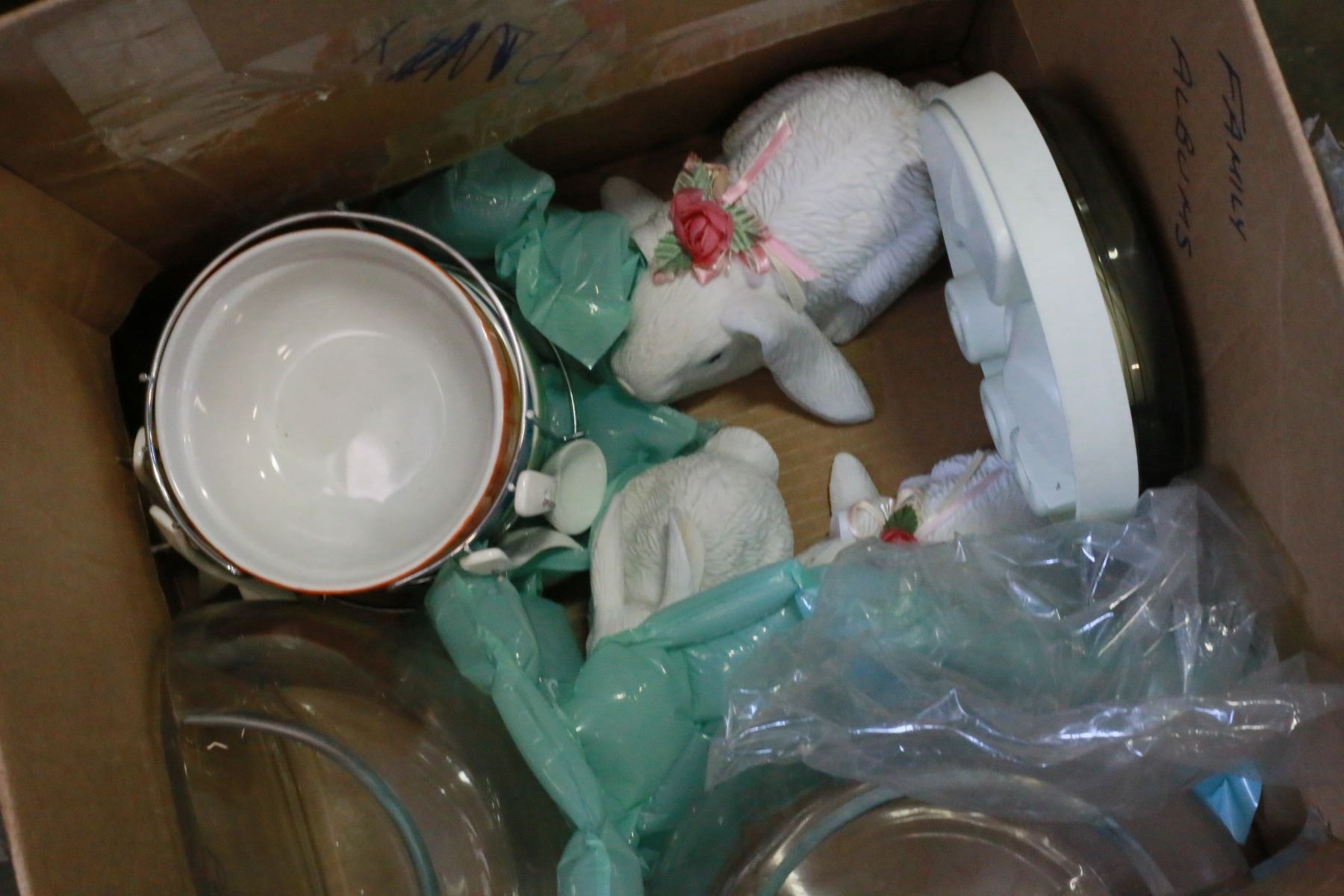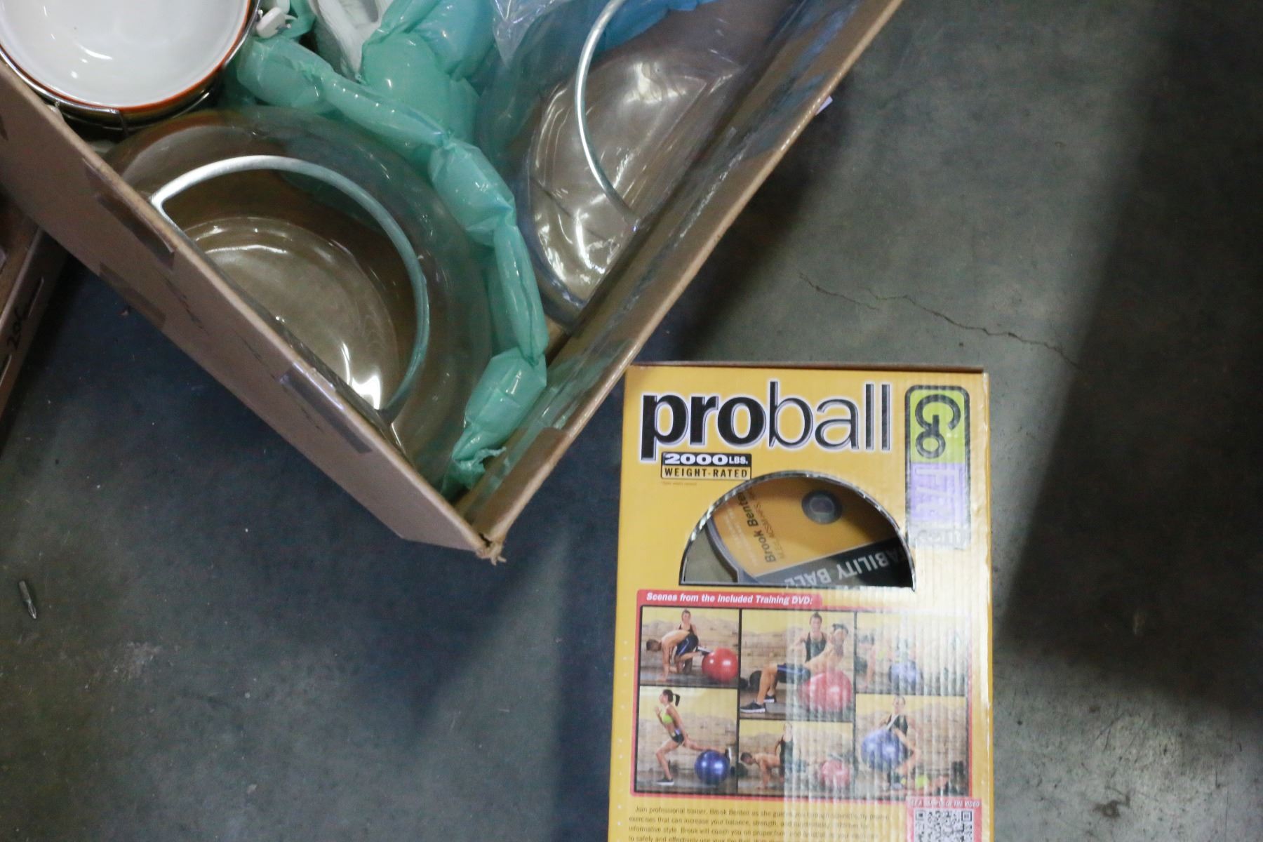 LOT OF GLASS FISH BOWLS THREE CERAMIC BUNNIES SOUP BOWLS WITH SPOONS AND GO FIT BALL