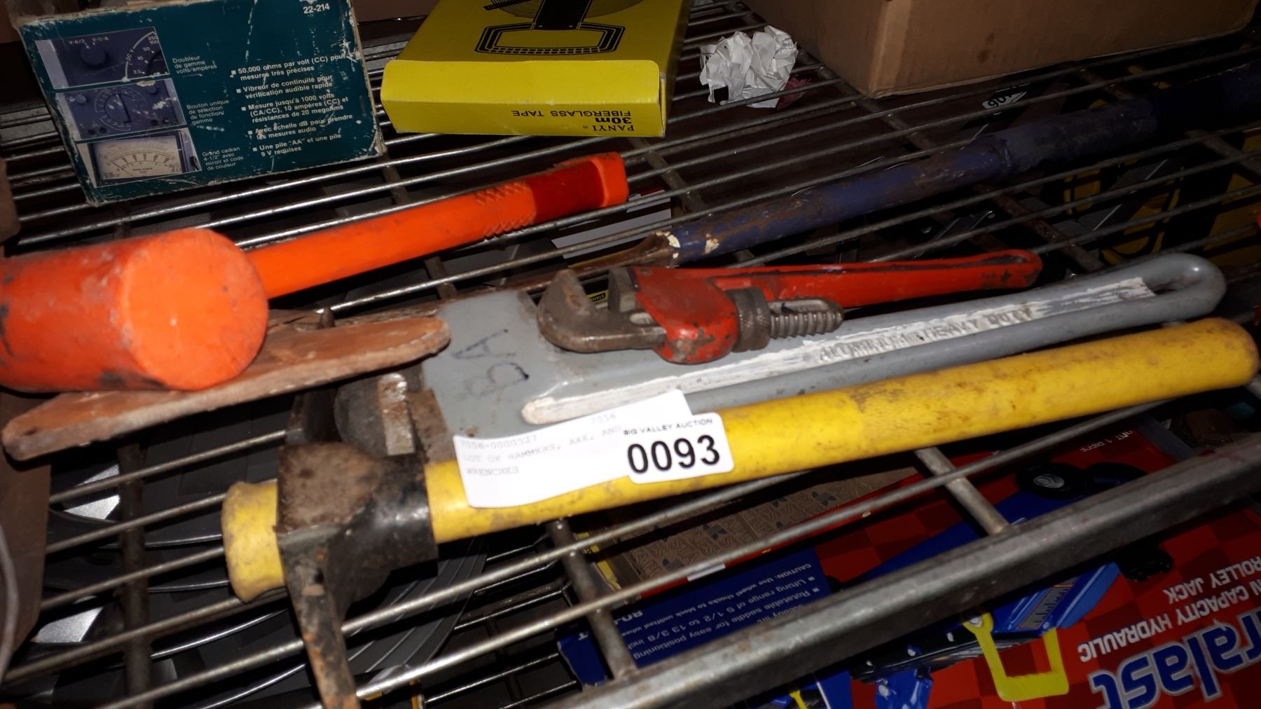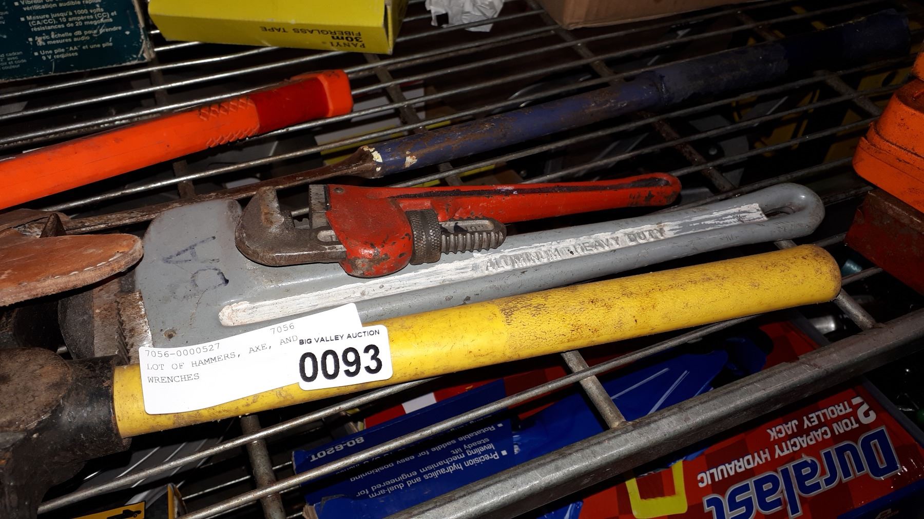 LOT OF HAMMERS, AXE, AND WRENCHES