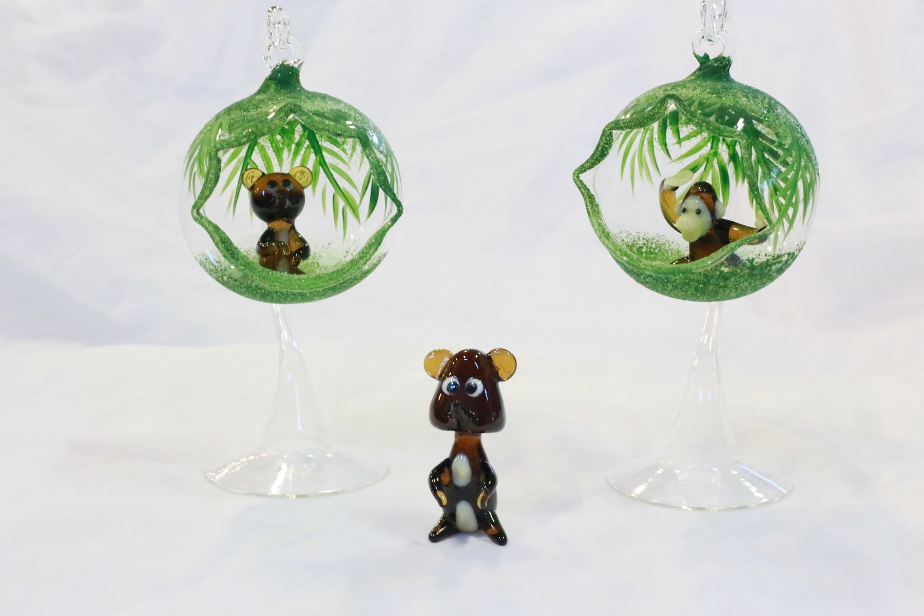 LOT OF HAND BLOWN GLASS BEAR MONKEY IN FOREST AND BEAR ORNAMENT
