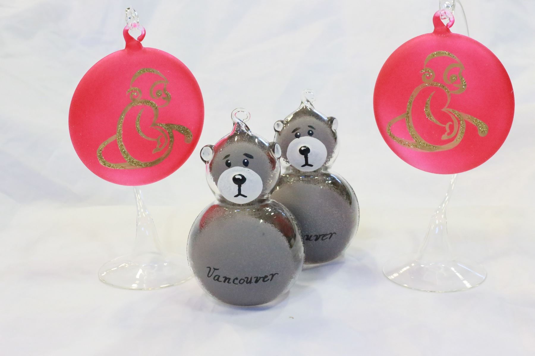 LOT OF HAND BLOWN GLASS VANOUVER BEARS ANDAND MONKEY ORANMENT ON STAND