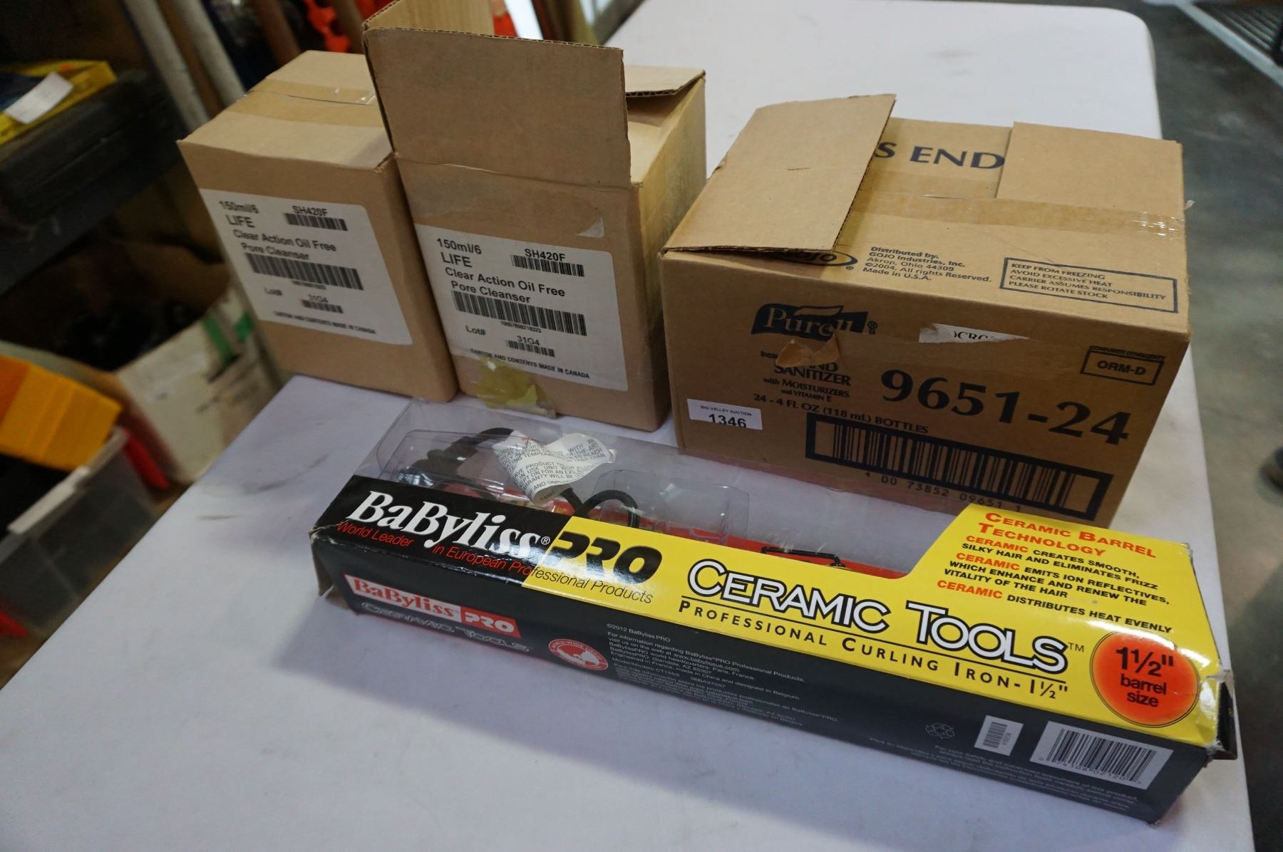 LOT OF HAND SANITIZER. [PRE C;EAMSER AND HAR CURLER