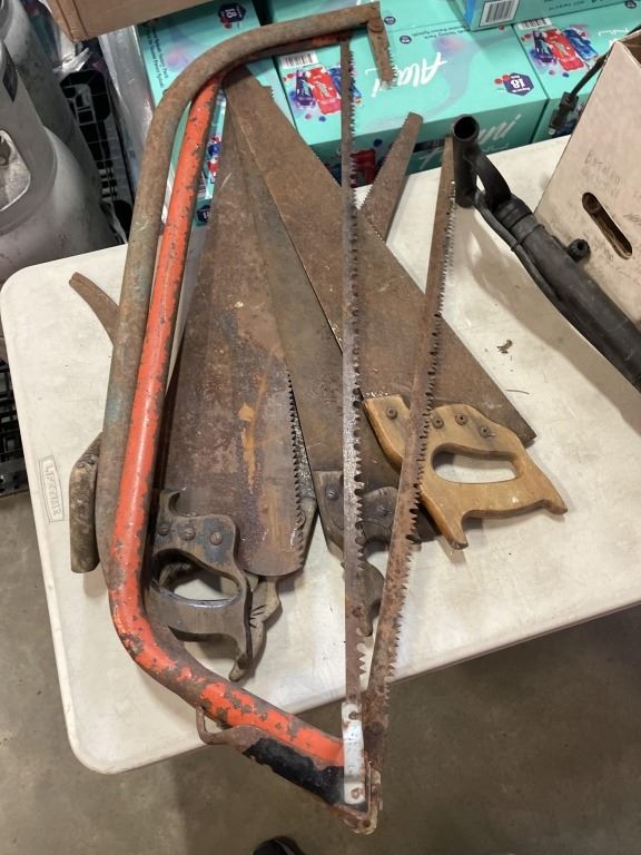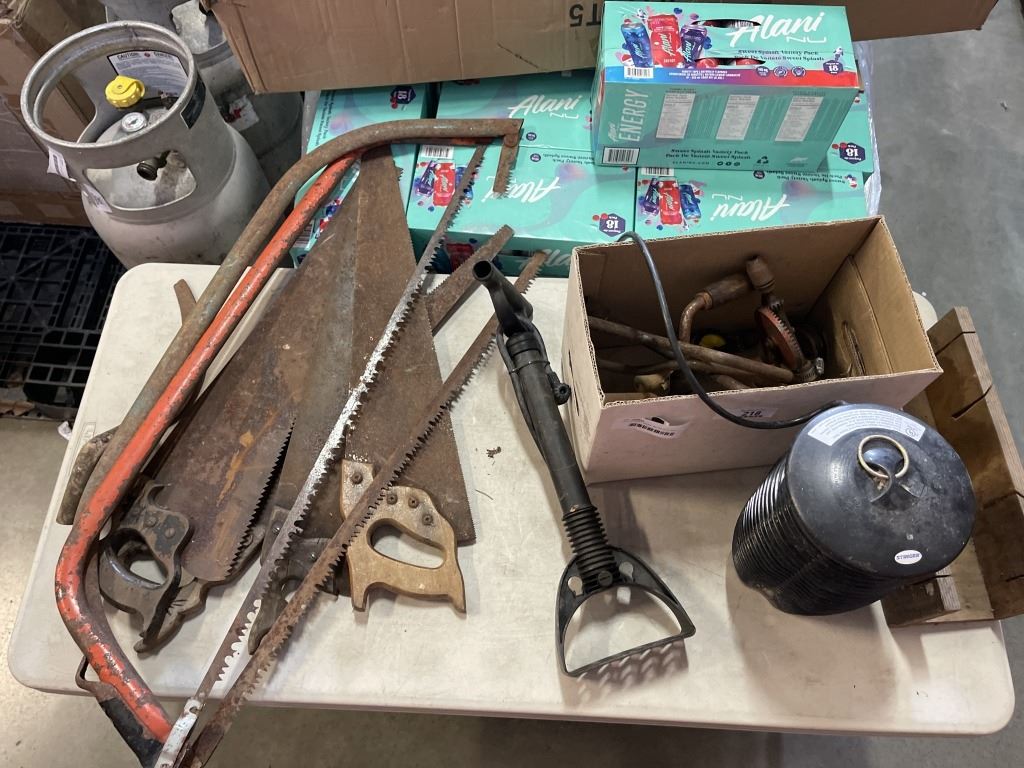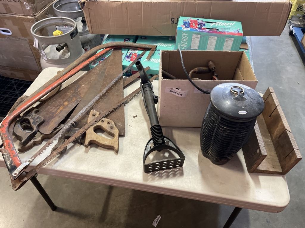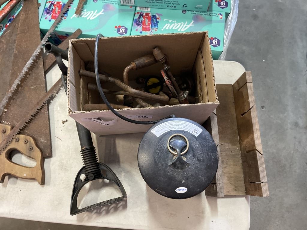 LOT OF HAND SAWS, MITRE BOX AND ANTIQUE DRILLS