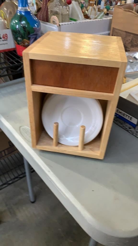 LOT OF HANDMADE BOWL, ICE CUBE TRAY ESPRSSO SET ON SWIVEL RACK AND MORE